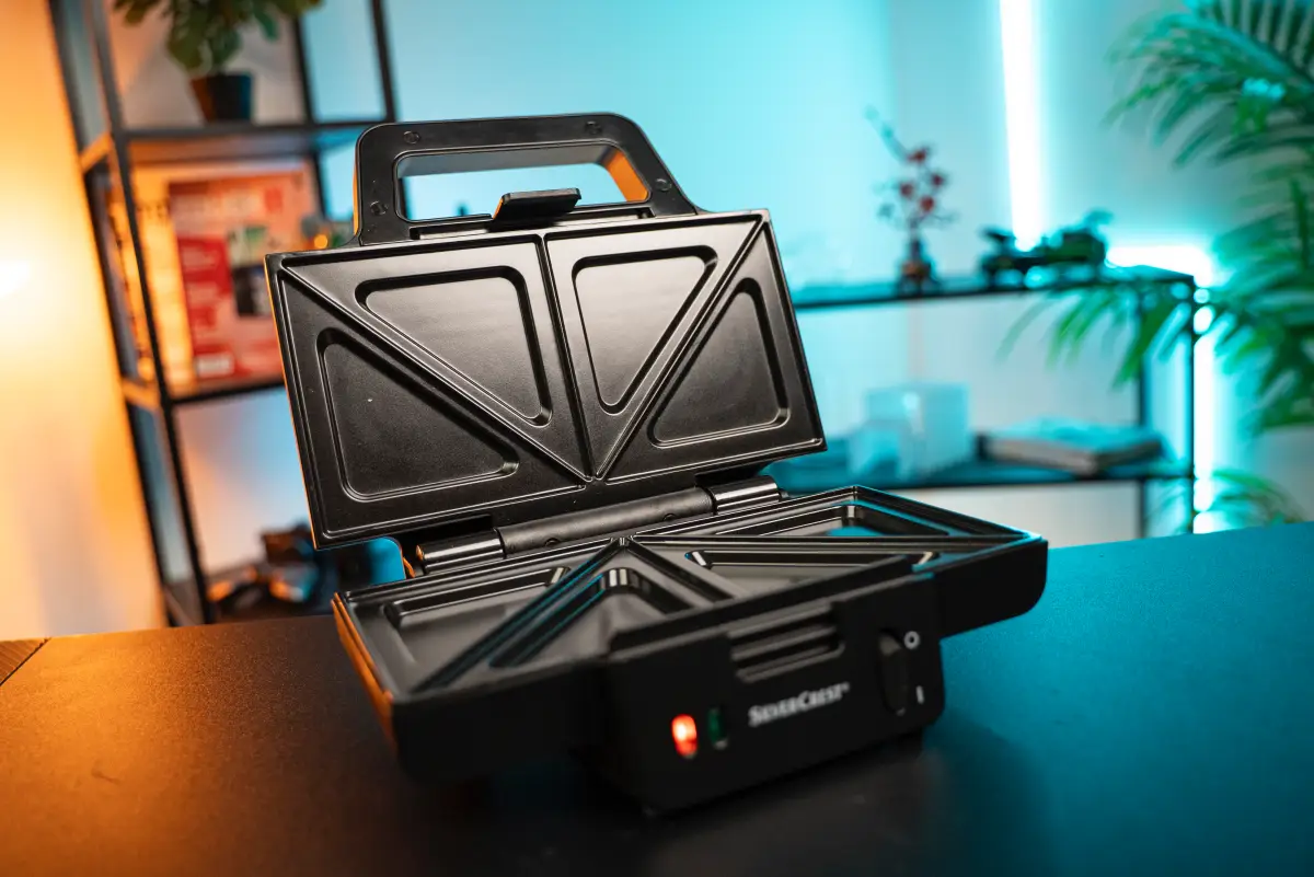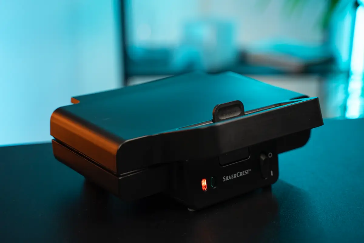 Je vybavený výkonným 900 W ohrevom, nepriľnavým povrchom Ilag, ktorý možno poznáte aj z iných Silvercrest kuchynských spotrebičov. V prednej časti sendvičovača je LED indikátorom pečenia (červená/zelená kontrolka) a tiež mechanický vypínač. Uzamykateľná rukoväť, navíjanie kábla a stabilná konštrukcia, ktoré poznáme aj z iných Silvercrest sendvičovačov, ho robia vhodným pre každodenné použitie.