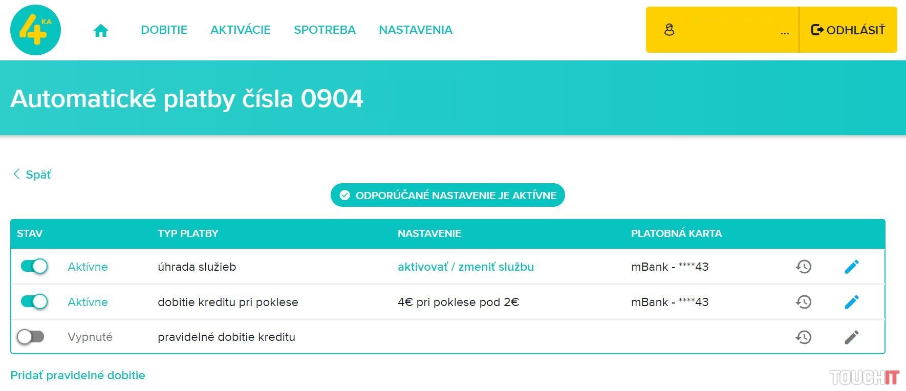4ka má v porovnaní s ostatnými operátormi výhodu. Jej balíky a paušály sú bez viazanosti, takže si ich môžete kedykoľvek aktivovať a deaktivovať či zmeniť. Z toho dôvodu vám obvykle postačí internetový prehliadač a pripojenie do internetu a všetky potrebné úkony zvládnete tam, kde sa práve nachádzate. Nie je treba hľadať kamennú predajňu. Cez internet si tiež objednáte SIM kartu a to niekedy aj s bonusovým kreditom zadarmo. Rozumieme však, prečo ľudia niekedy preferujú vykonať tento úkon osobne v kamennej predajni. Samoobslužná zóna 4ky je dostupná na webovej stránke 4ka.sk/moja-zona/ a je rozdelená do niekoľkých častí. V sekcii Dobitie si môžete nastaviť automatické platby alebo kredit dobiť jednorazovo platobnou karou či kupónom. K dispozícii je tiež história dobití a prehľad faktúr. V sekcii Aktivácie si môžete jednoducho a pohodlne aktivovať ľubovoľný balík a paušál operátora. Takisto ho môžete podľa potreby deaktivovať alebo zmeniť paušál na iný – podľa vašej potreby. Praktické je, že v rámci aktivácie služieb si môžete zapnúť automatickú úhradu z uloženej platobnej karty. Toto riešenie je praktické – nemusíte si dobíjať kredit a následne platiť za paušál kreditom, ale konkrétnu sumu zaplatíte priamo platobnou kartou. V sekcii Spotreba nájdete prehľad spotreby, aktuálny zostatok a aj detailné informácie o vašej spotrebe. A v neposlednom rade, v Nastaveniach môžete spravovať telefónne čísla, ktoré máte priradené vo vašej zóne a tiež si uložiť platobnú kartu pre jednoduchšie platenie za paušály a dobíjanie kreditu. Údaje o karte sú bezpečne uložené v Tatra banke.