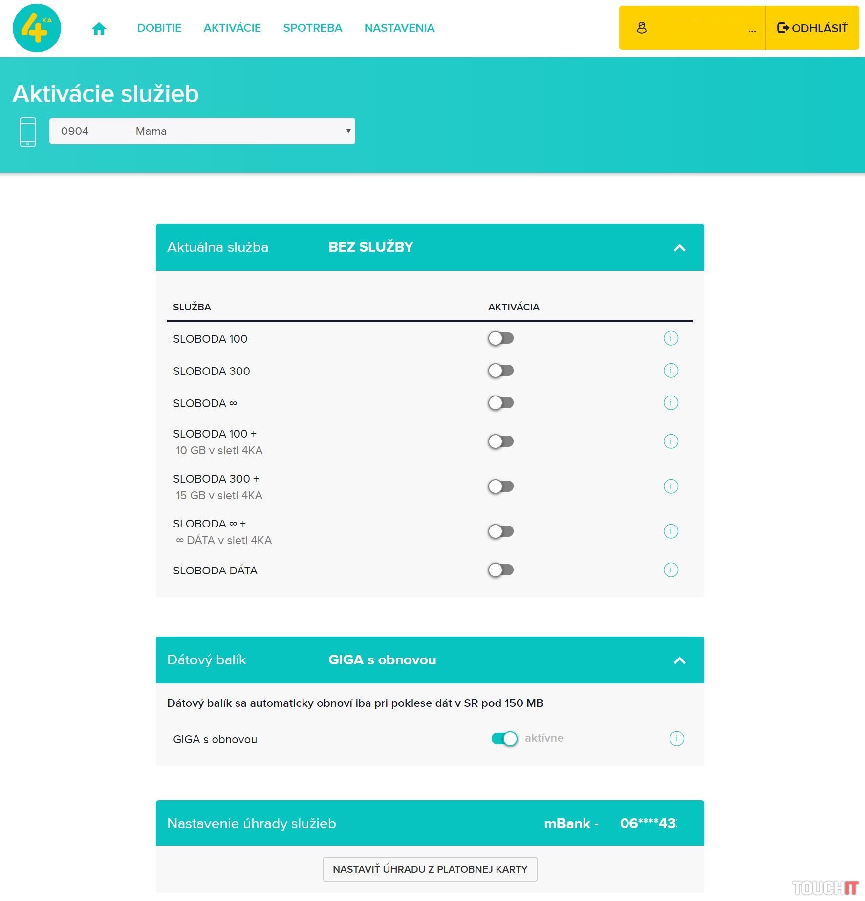 4ka najnovšie pridala ďalší kanál, ktorý umožňuje správu a aktivovanie/deaktivovanie služieb. Je ním mobilná aplikácia Moja 4ka pre smartfóny so systémom Android a iOS. Tá je rozdelená do niekoľkých častí, podobne ako webová Moja zóna a prehľadným spôsobom informuje o vašej spotrebe a tiež aj dostupných službách. Okamžite tak získate prehľad o tom, aké balíčky máte aktivované a čo 4ka ponúka. Ak by ste sa náhodou nevedeli vyznať v ponuke webovej Mojej zóny, aplikáciu Moja 4ka odporúčame. Je výrazne prehľadnejšia a intuitívnejšia.