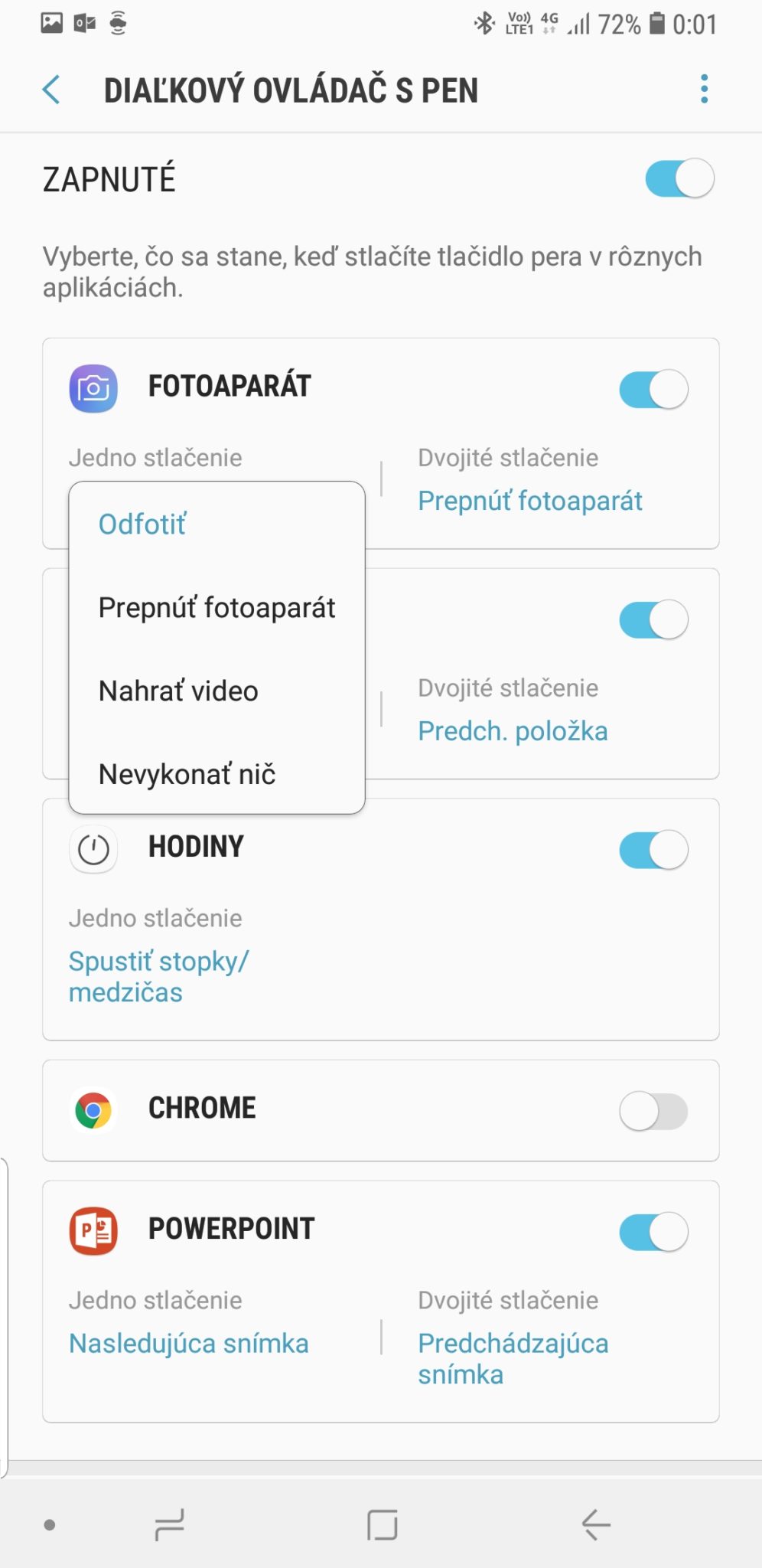 Pero je v prípade Galaxy Note9 iné, ako v predchádzajúcich verziách. Je pripojené pomocou Bluetooth a to znamená, že sa s perom dá robiť viac ako doteraz. Využijete ho ako diaľkovú spúšť fotoaparátu alebo ako ovládač na premietanie fotiek z galérie či slidov z prezentácie a tiež pri prehrávaní hudby na preskakovanie skladieb. O tom, čo bude pero robiť rozhodujete vy a príslušné voľby nájdete v položke Nastavenia – Pokročilé funkcie – Pero S Pen. Voľbou Diaľkový ovládač S Pen zistíte, ako je to s batériou v pere a hlavne určíte, čo sa má robiť, keď potlačíte tlačidlo na pere. Vybrať si môžete aj to, čo sa stane, keď potlačíte tlačidlo na pere vo vybraných aplikáciách.