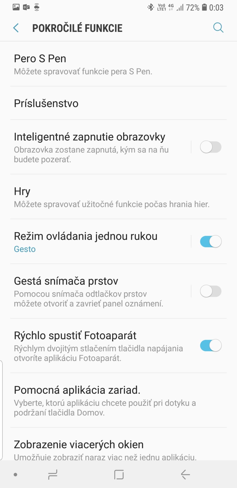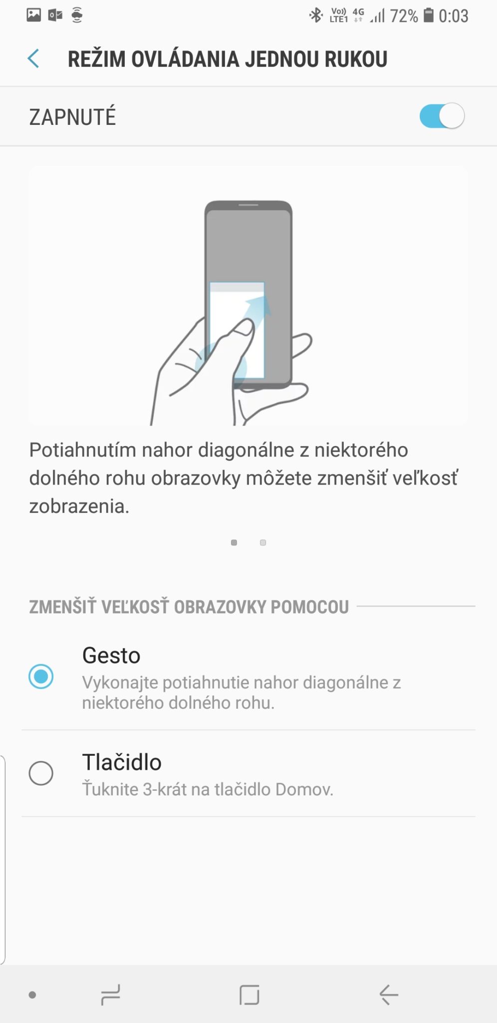 Keďže je tu veľký displej, ovládanie jednou rukou môže byť problém. Ten sa dá ľahko vyriešiť v Nastavení, kedy si povolíte Režim ovládania jednou rukou. Nájdete ho v Nastavenia – Pokročilé funkcie. Vybrať si môžete aktiváciu tohto režimu Gestom alebo trojitým stlačením tlačidla Domov. Nám sa viac oplatilo Gesto a môžete si určiť a to, na ktorej strane vznikne zmenšené okno na ovládanie telefónu. Teda vpravo alebo vľavo, podľa tohto ktorou rukou držíte telefón.