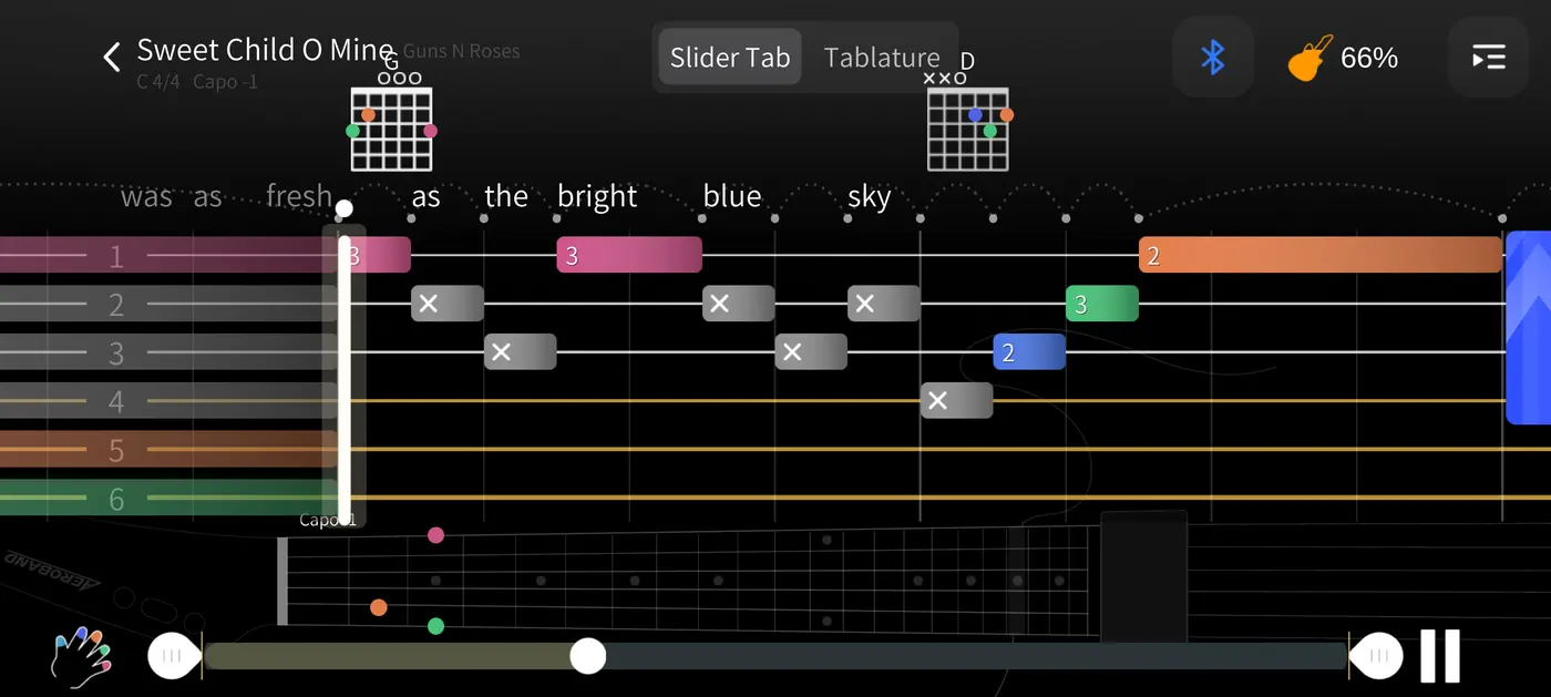 Hra s aplikáciou: AeroBand Guitar sa dá prepojiť s výukovou aplikáciou, ktorá odomyká interaktívne režimy, sprievody a podsvietený hmatník pre ľahkú orientáciu pri učení akordov.