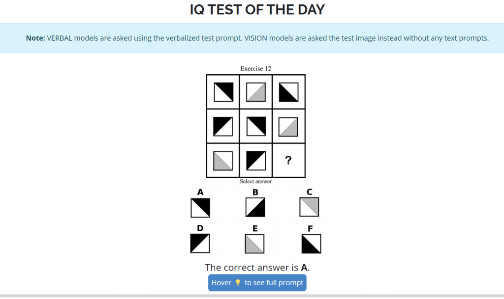 Okrem toho sú modely testované na grafických IQ testoch. Musia sa popasovať s úlohami znázornenými ako ukazuje príklad nižšie. Táto stránka vám môže pomôcť pri výbere modelov, ktoré ste doteraz nepoznali a použiť ich v upravenom variante na počítači lokálne cez LM Studio.