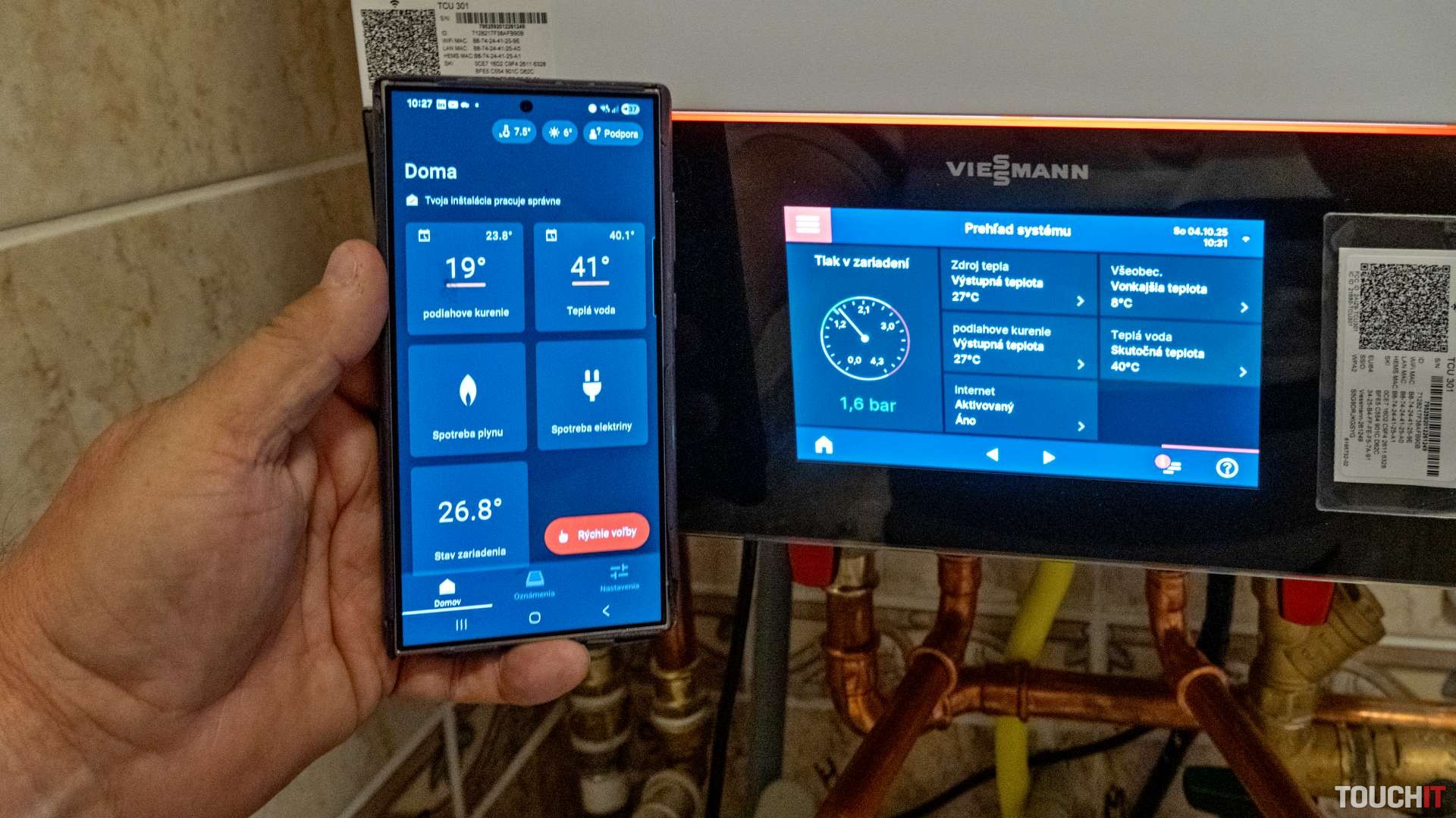 Pomocou aplikácie som potom nastavil časový plán vykurovania a prípravy teplej vody. Veľkou výhodou je možnosť tento plán prispôsobiť aktuálnym podmienkam buď pomocou dotykového ovládania priamo na kotli, na vzdialenom ovládacom paneli, alebo pre mňa najjednoduchšie cez mobilnú aplikáciu. Ide napr. o okamžitý ohrev teplej vody v dobe štátnych sviatkov alebo dovolenky. Ovládanie je veľmi jednoduché a prispôsobené bežnému človeku. V mobilnej aplikácii je to povel „Chcem teplú vodu„, ktorému rozumie každý.