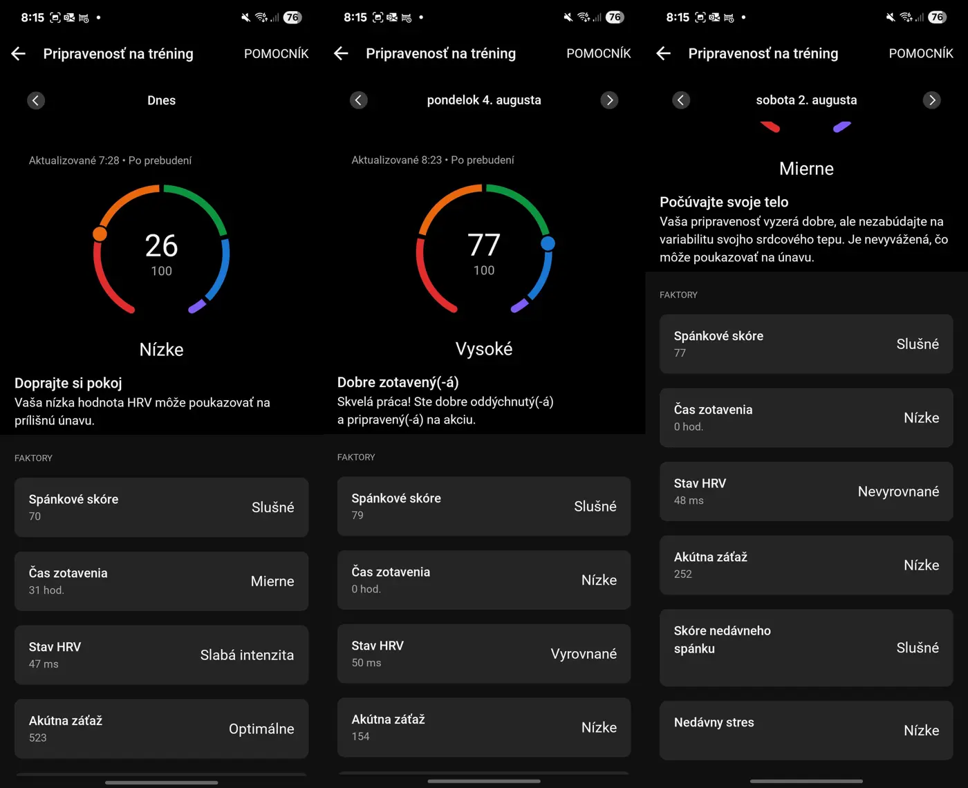 Podobne funguje aj funkcia Pripravenosť na tréning, ktorá takisto vyhodnocuje kvalitu regenerácie a zaťaženie počas dňa a aktivít, avšak s dôrazom na vyhodnocovanie vašej pripravenosti na trénovanie. Funkcia vám rýchlo a zrozumiteľne povie, v akom stave je váš organizmus z hľadiska celkového tréningového procesu a regenerácie organizmu. Hodinky vám každý deň oznámia vašu pripravenosť, ktorú definujú číslom v rozmedzí 1 až 100.