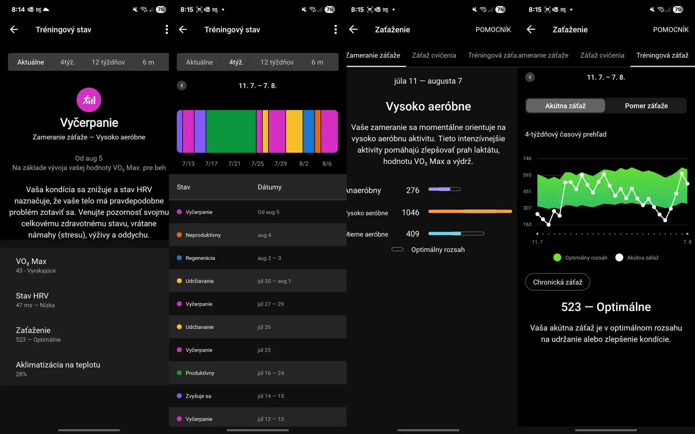 Nadstavbou vyhodnocovania účinku jednotlivých tréningov je funkcia Tréningový stav. Tá je rozdelená do dvoch častí. Vyhodnocovanie tréningového stavu a záťaže zbiera dáta zo všetkých vašich cvičení a vyhodnocuje tréningovú záťaž za posledných 7 dní. Na základe vašej kondície a histórie cvičení vám hodinky odporučia optimálny rozsah záťaže, aby bol tréningový proces pre vás prínosný.