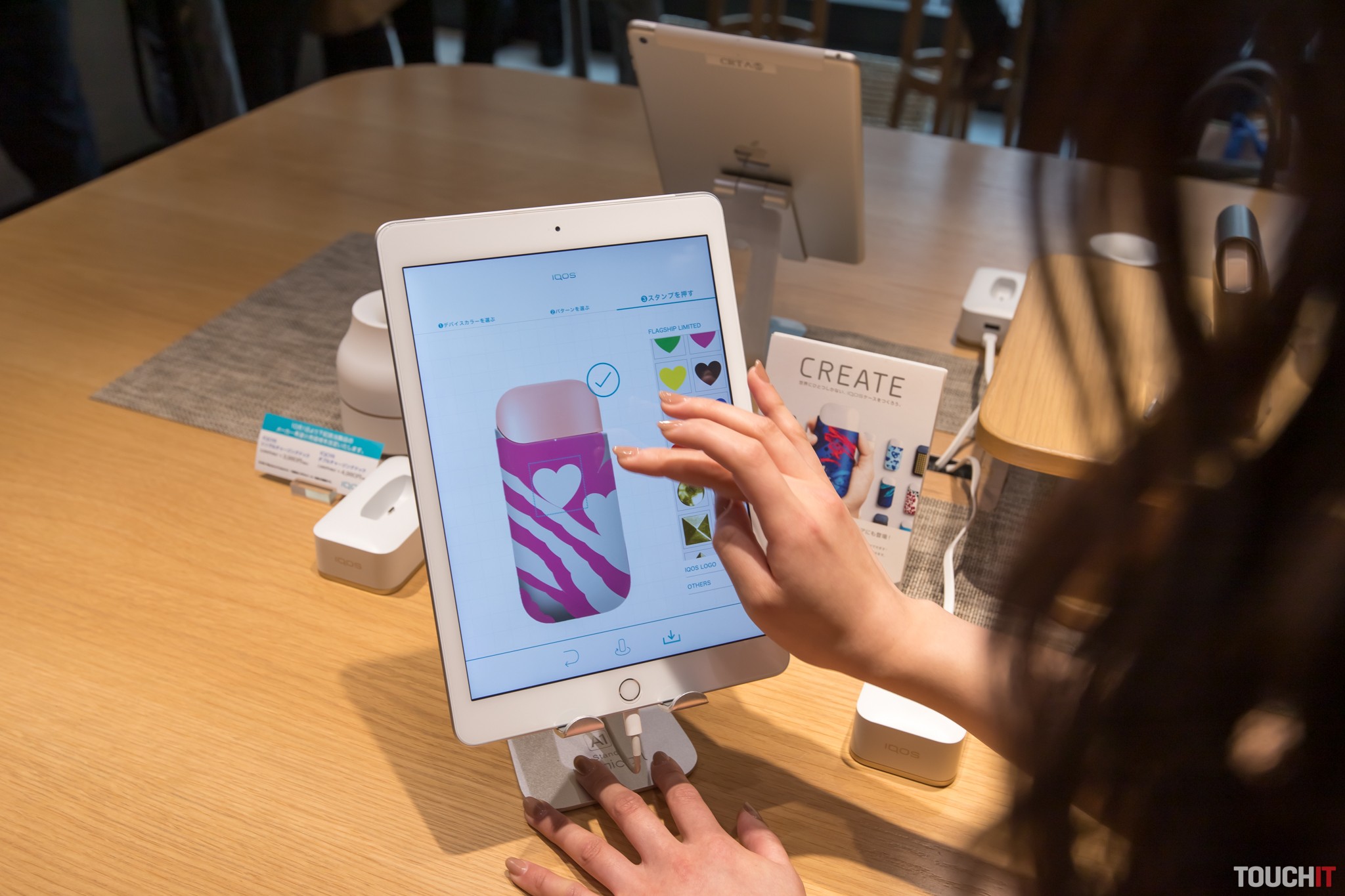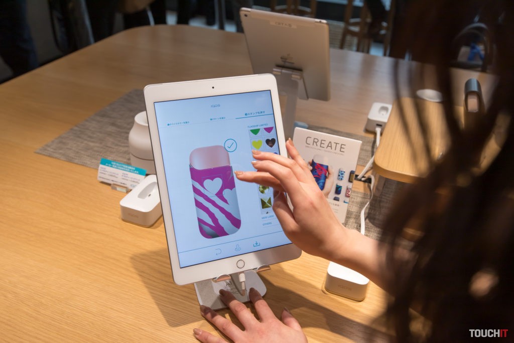 Horné poschodie je vyčlenené na individuálne prispôsobenie. Nájdete tu aplikáciu pre iPad, ktorou si pripravíte dizajn puzdra presne tak, ako to cítite. V Japonku sú veľmi v obľube srdiečka a červená farba.