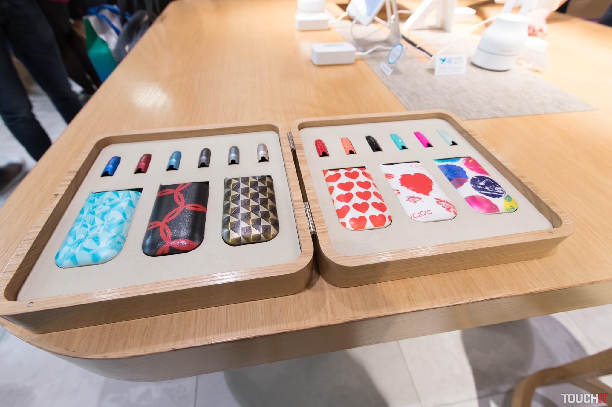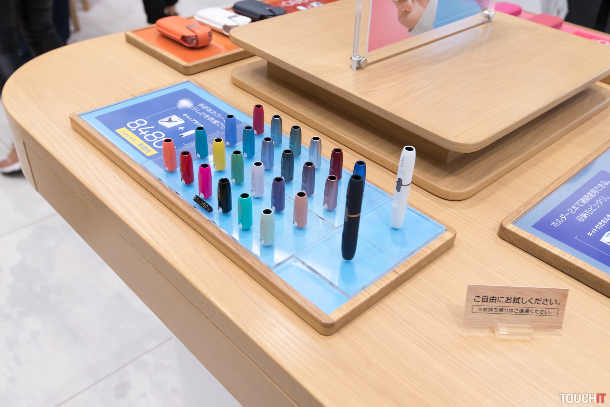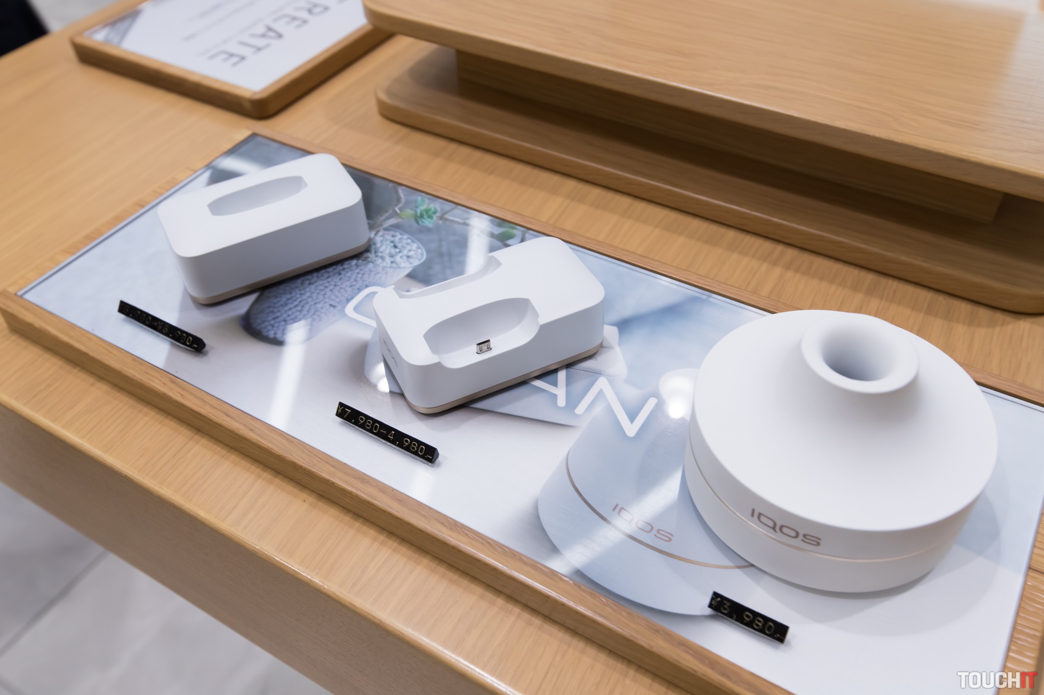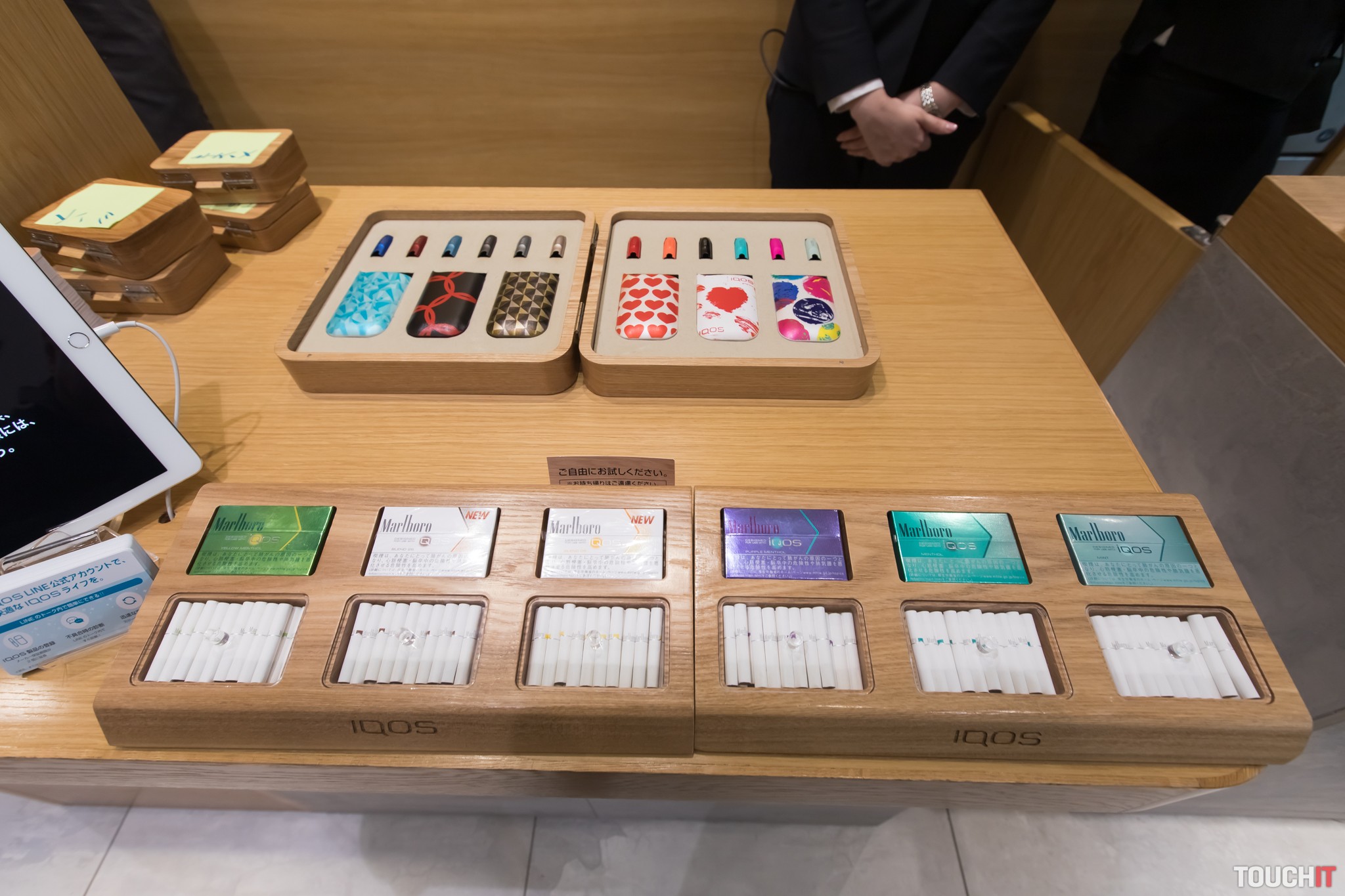 V prízemí si môžete vybrať z klasického tovaru, vyskúšať môžete aj náplne HEETS s viacerými exotickými príchuťami. Skúšanie je zadarmo, IQOS tu môžete voľne používať a pripravení sú aj na nabitie puzdra vášho vlastného IQOSu. V ponuke prevládajú puzdra s japonskými vzormi, vybrať si môžete aj z popolníkov a ďalšieho príslušenstva ako sú kožené obaly. Náplne HEETS majú v Japonsku označenie Marlboro, ktoré sa už na Slovensku ani v ostatnej časti Európy nepoužíva. Firma Philip Morris dokonca uvažuje utlmení tejto značky práve v prospech IQOS.