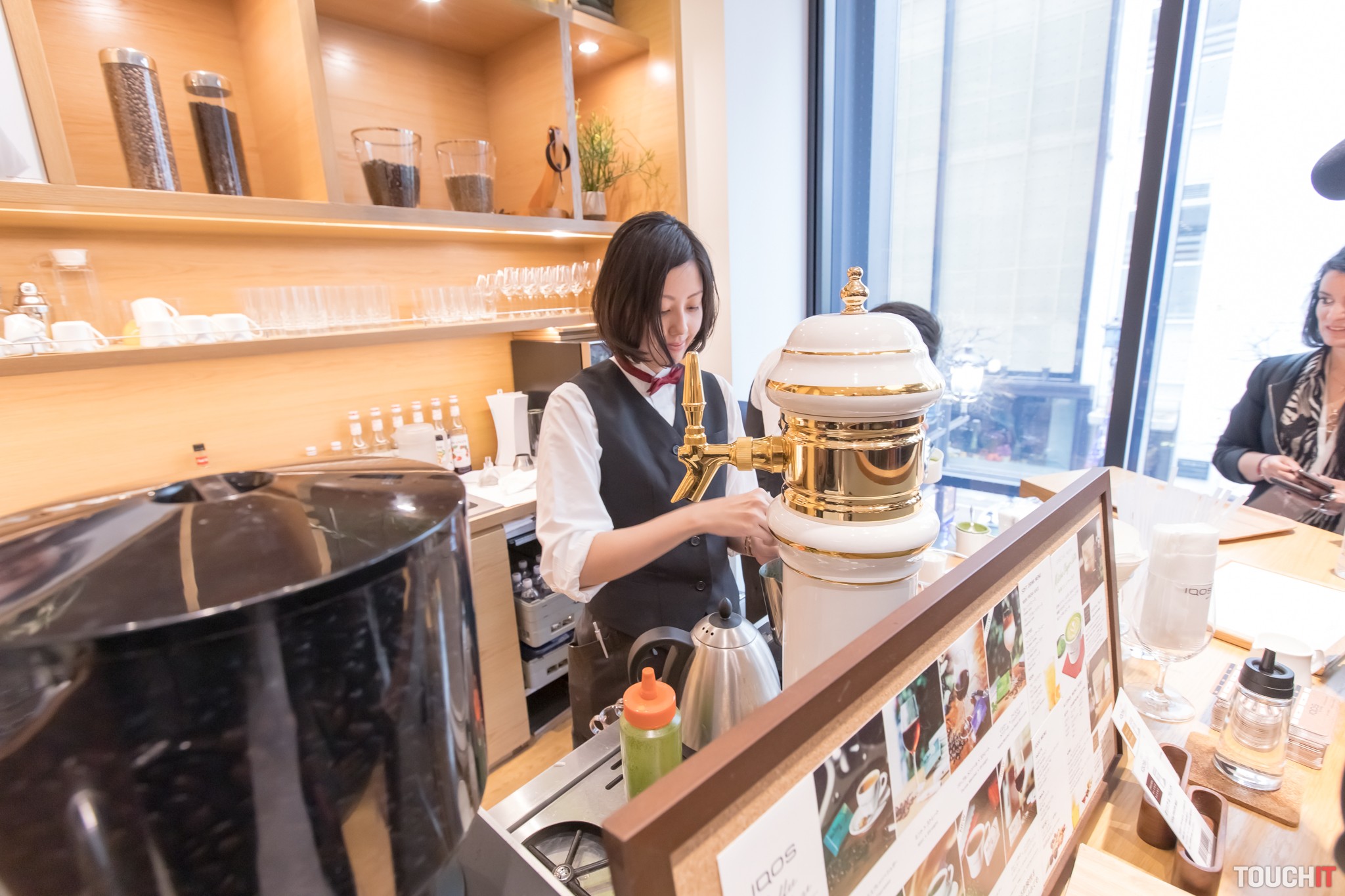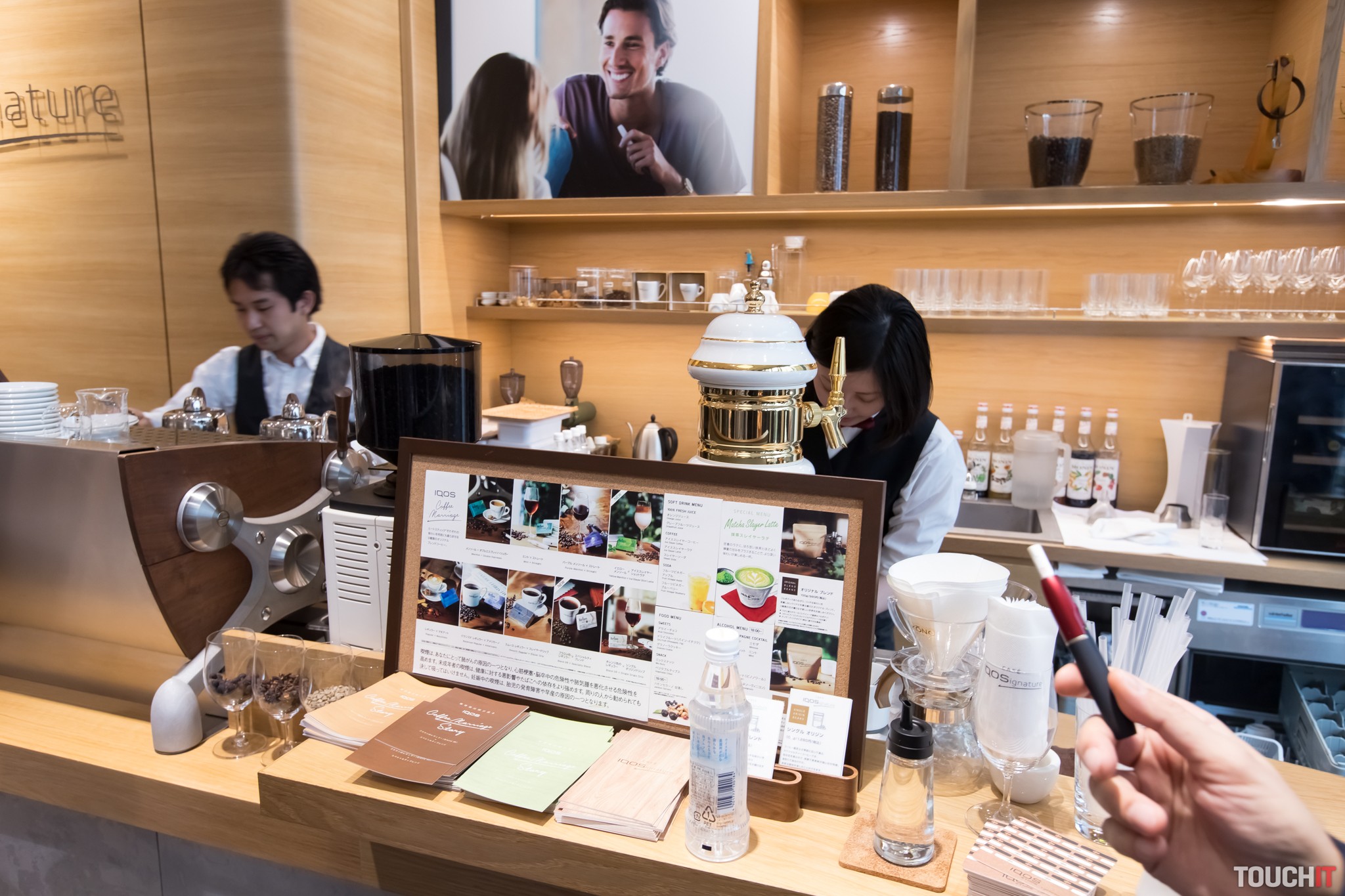 Samostatnou častou tejto značkovej predajne je kaviareň. Potvrdzujeme, že tu robia vynikajúcu kávu a v ponuke je aj zelená káva, ktorá by mala spaľovať tuky. A samozrejme, vybrať si môžete aj z ponuky japonských čajov. Počas pitia kávy môžete prirodzene aj používať IQOS. Nájdete tu aj knihy a magazíny, dostatok miesta na relax.