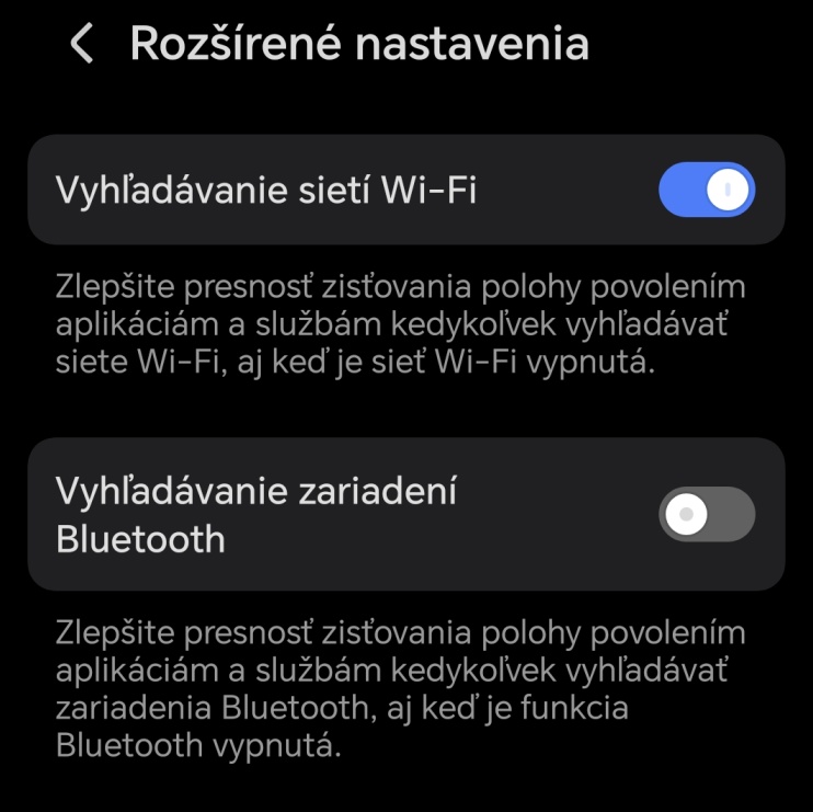 V časti Rozšírené nastavenia sú položky na deaktiváciu Wi-Fi a Bluetooth. Keď sú obe zapnuté, funguje hľadanie BT zariadení aj pri vypnutom Bluetooth. Vďaka tomu nájdete zariadenia ako slúchadlá alebo špeciálne LE zariadenia. LE profil sa dá vypnúť vo vývojárskych nastaveniach vášho smartfónu, no toto netreba robiť, ak na to nemáte konkrétny dôvod.