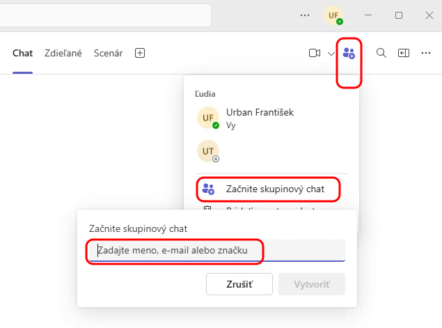 Alternatívnym postupom je, že všetkých najprv pozvete do textového chatu a hovor zahájite až následne. Postupujte ako v predošlom prípade a v rámci okna programu Teams vyberte akýkoľvek existujúci kontakt a otvorte jeho okno s textovou komunikáciou. Následne v pravom hornom rohu kliknite na ikonku dvoch postavičiek so znamienkom plus, ktorá sa nachádza napravo od ikonky slúchadla/kamery. Ak ju kliknutím otvoríte, uvidíte v nej ponuku – Zahájiť skupinový chat. Kliknite na ňu a písaním do poskytnutého vyhľadávacieho políčka napíšte toľko mien, koľko uznáte za vhodné a klikaním ich postupne pridávajte.
