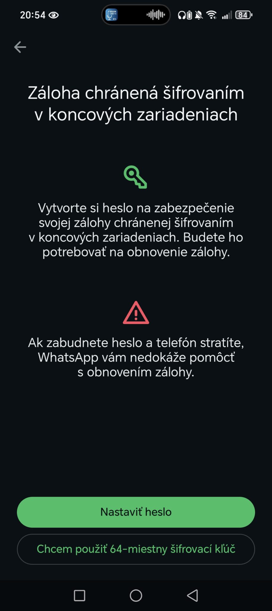 Stále platí, že ide v oboch prípadoch o koncové šifrovanie, takže ak heslo alebo kľúč zabudnete, WhatsApp nebude vedieť obnoviť vaše zálohy. Tento kľúč je vygenerovaný automaticky a je nutné si ho poznačiť na bezpečné miesto.