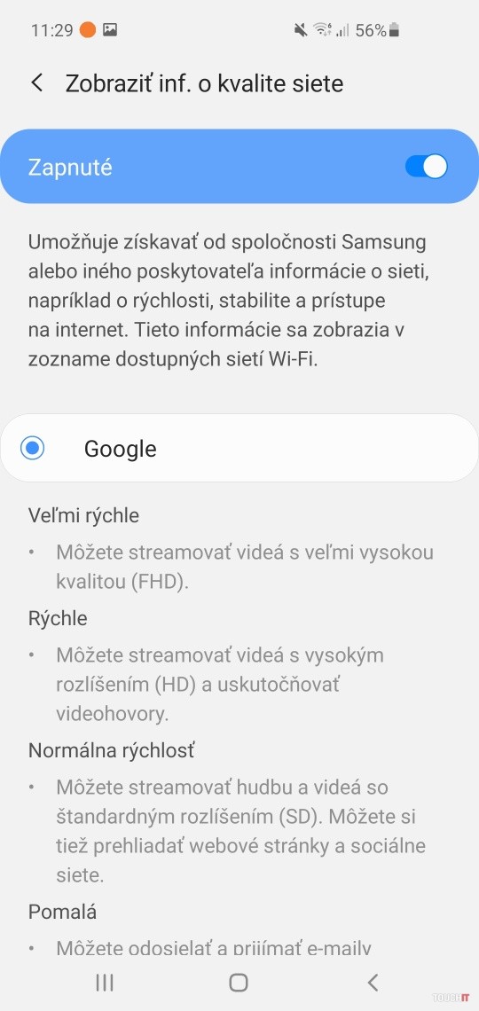 Funkciu nájdete v Nastaveniach systému v časti Pripojenia – Wi-Fi. V sekcii Wi-Fi potom ťuknete na tri zvislé bodky hore na displeji, aby sa zobrazilo ďalšie menu. Tu nájdete voľbu Rozšírené. Ak je funkcia dostupná, bude pod položkou Zobraziť inf. o kvalite siete. Najviac ju využijete v prípade pripojenia na hotspoty, ktoré vy osobne nepoznáte. Google totiž zbiera informácie o rýchlostiach sietí a na základe toho dáva používateľom tieto informácie. V našom prípade aj spoločnosť Samsung, na čo sama upozorňuje a nič pred vami netají. Ak totiž nastane situácia, že bude sieť pomalá, je zbytočné, aby ste na nej boli pripojení. Máte možnosť sa pripojiť na inú sieť alebo využiť radšej mobilné dáta. Telefón vás na toto upozorní. Rýchlosť siete neznamená kvalitu signálu. Ten je ovplyvnený najmä vašou vzdialenosťou od Wi-Fi routera, ktorý zvyčajne tento signál vysiela. Sieť sama o sebe môže mať dostatočne rýchlu konektivitu. Prečítajte si aj: https://touchit.sk/ako-nastavit-wi-fi-na-samsungu/311850Podobné články
