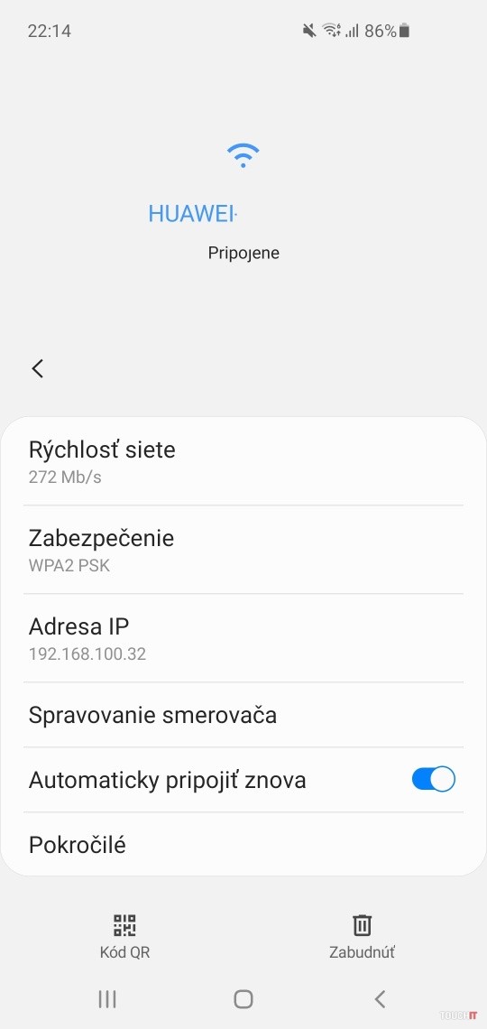 Rýchlosť siete sa dozviete z jej popisu v nastaveniach, no režim kvality je niečo, čo zaviedol v minulosti Google. To však neznamená, že ju majú priamo integrovanú všetky smartfóny. Ide v princípe o to, aby ste neboli pripojený k pomalej sieti, ak je dostupná rýchlejšia. Aby nedošlo k omylu, mnoho smartfónov priamo neprezentuje túto funkciu, no istú formu implementovanú má. Aj preto sa vám môže stávať situácia, kedy sa telefón bude striedavo pripájať na 2,4 a 5 GHz sieť vášho routeru, ak máte dva SSID. Vtedy je najlepšie odobrať automatické pripojenie na jednu tým, že ju dáte ako zabudnutú a na znovu pripojenie bude treba zadať heslo. Nasledujúce ukážky sú zo smartfónu Samsung S10. Plošne takisto neplatí, že nasledujúce možnosti nájdete na všetkých zariadeniach od Samsungu. Napríklad Galaxy M51 ju v nastaveniach Wi-Fi dostupnú nemá.Ako na to?