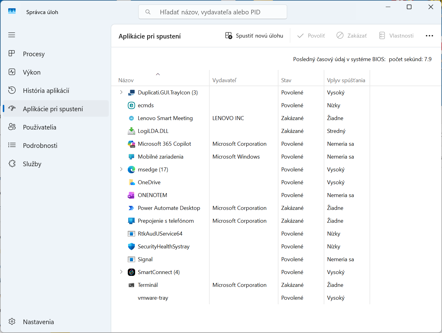 V Správcovi úloh (Ctrl + Alt + Del) na karte Aplikácie pri spustení nájdete zoznam aplikáciu spúšťaných hneď po nábehu systému. V stĺpci Vplyv spúšťania sa zobrazuje dopad na systémové prostriedky. Kliknite pravým tlačidlom na riadok s aplikáciou a vyberte Zakázať / Povoliť na zmenu spúšťania.