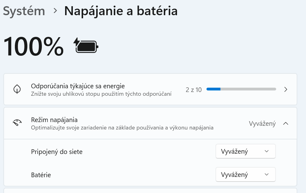 V Nastavenia – Systém – Napájanie a batéria – Režim napájania, vyberte položku Najvyšší výkon. Tohto nastavenia sa nemusíte obávať a ak počítač nebudete aktívne používať alebo nebude potrený vysoký výkon, nebude v režime najvyššieho výkonu bežať neustále. Do tohto režimu sa ale zapne, keď to bude potrebné.