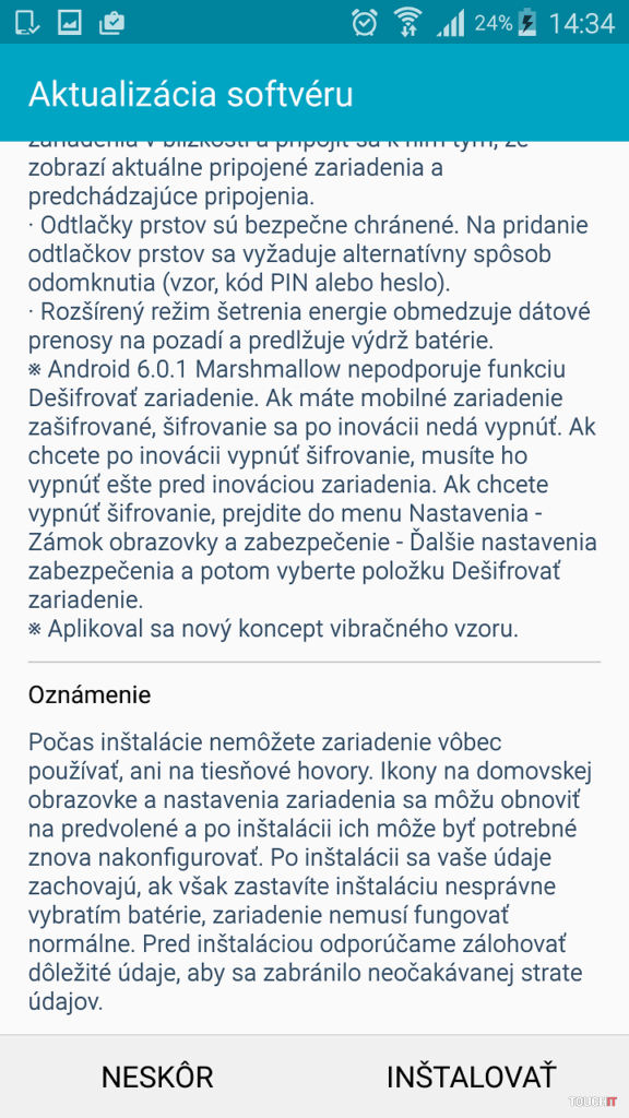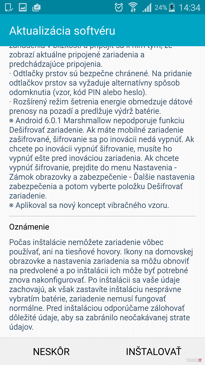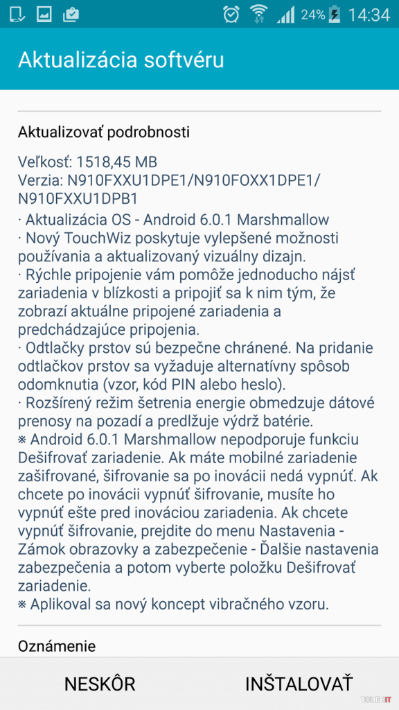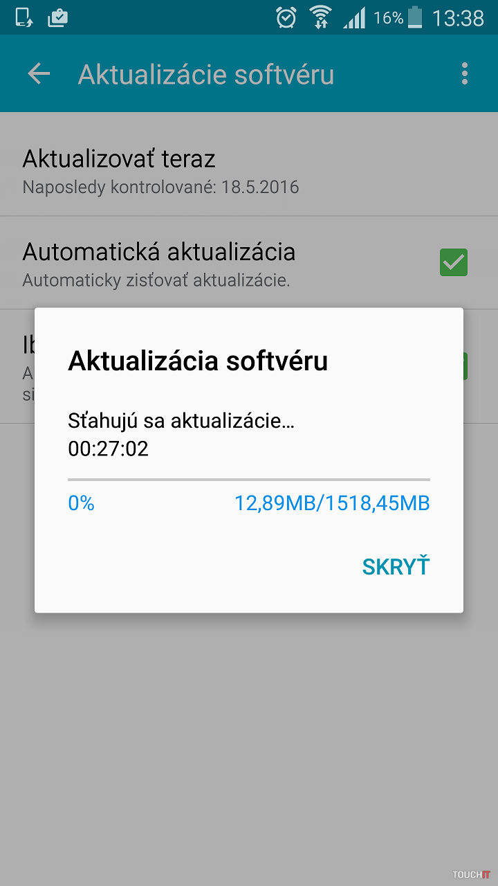 Veľkosť aktualizácie je 1518,45 MB. Nakoľko je to veľký objem dát, jej stiahnutie je výhodnejšie cez Wi-Fi sieť.