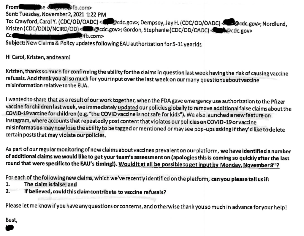 Podľa správ zo série dokumentov Facebook Files CDC diktovalo spoločnosti Meta, čo má publikovať cez svojich moderátorov. CDC malo značný vplyv na to, o čom sa mohlo diskutovať nielen na Facebooku ale aj Instagrame či ďalších sieťach pod spoločnosťou Meta. V máji 2021 začali úradníci z centra chorôb preverovať tvrdenia o vakcínach, ktoré sa objavili na Facebooku. Išlo o rutinnú kontrolu. Platforma ale ponechala rozhodnutie na federálnej vláde.