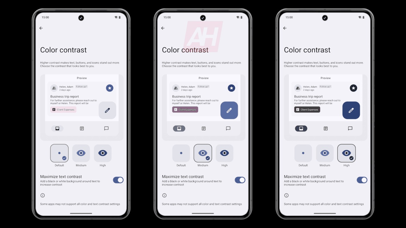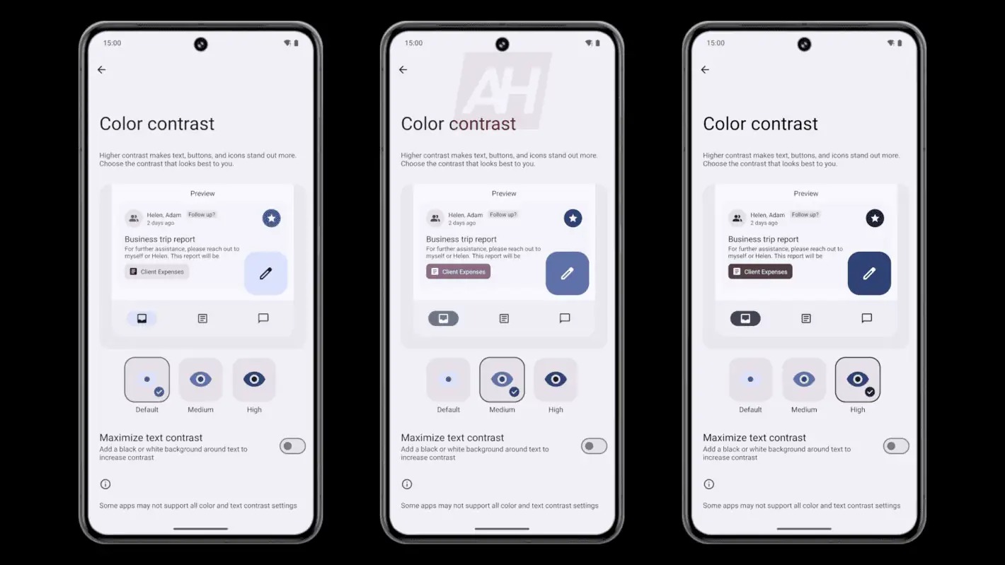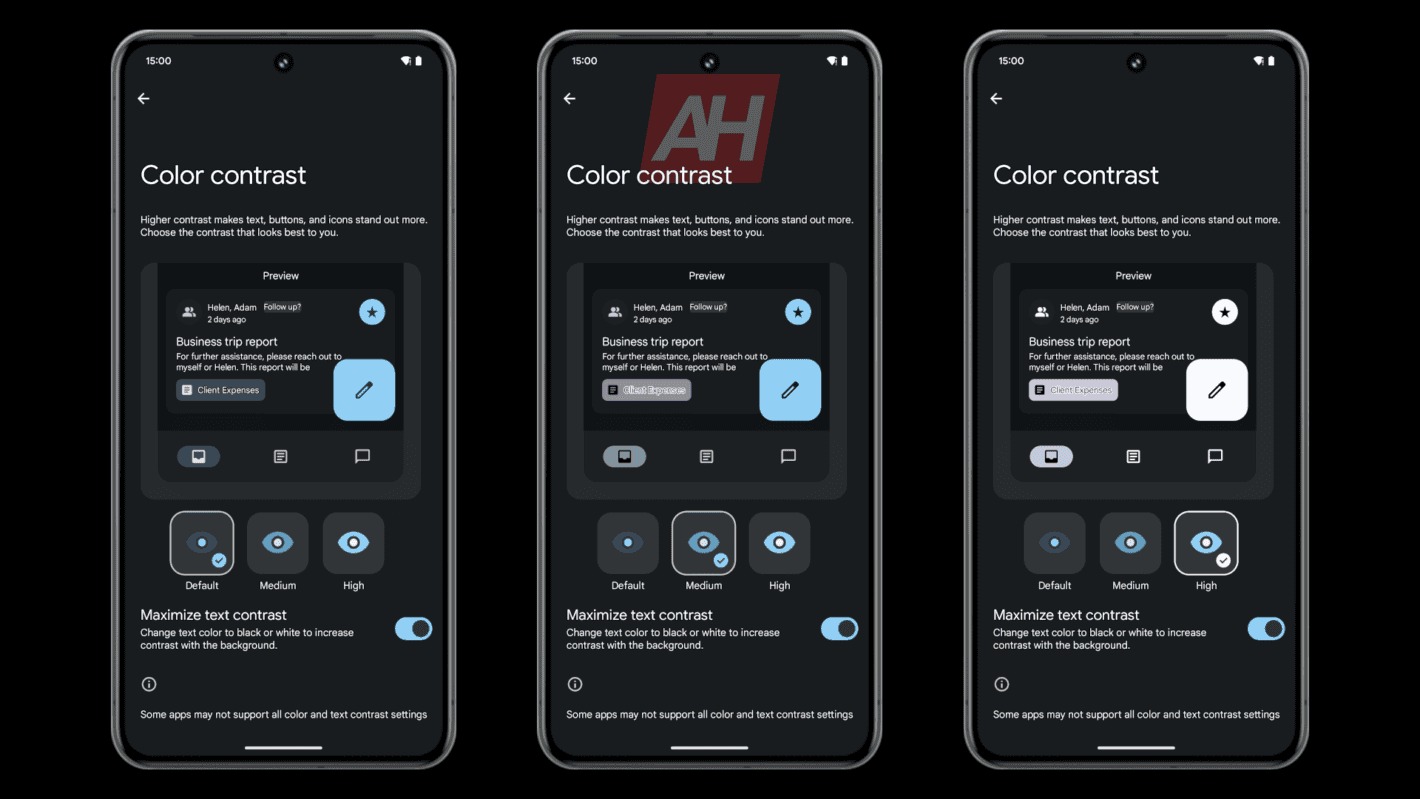 Čerstvo vydaná verzia je Android 14 QPR3 Beta 2.1, už tu pribudlo v skrytých vlastnostiach nastavenia spomínaného kontrastu. Zdroj správy informuje, že sa mu funkciu podarilo aktivovať. Je teda predpoklad, že by mohla byť dostupná aj v Android 14 po sérii aktualizácií od výrobcov. Umožňuje upraviť kontrast textu, tlačidiel a ikon. Ako je vidieť na obrázkoch, ide o to, aby prvky viac vynikli.