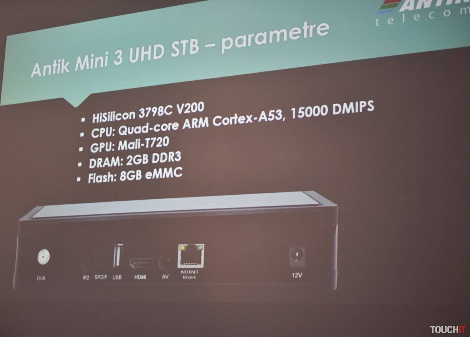 Antik Mini 3 a jeho vlastnosti Set-top box Mini 3 využíva nový ARM procesor HiSilicon 3798C V200. Okrem podpory UHD a HEVC podporuje aj formát VP9, ktorý využíva napr. HDR režim v službe YouTube. Antik Mini 3 má vo výbave aj 2 GB RAM, HDMI 2.0a, USB 2.0 aj 3.0, vysielač pre SmartHome zariadenia v štandardne Z-Wave a výstupy CVBS a TOSLINK. Antik predstavil UDH set-top box vo verzii Mini 3, pripravuje aj modely Nano 3 pre OTT vysielanie a Nano Lite so systémom Android. Používatelia IPTV služieb si môžu akýkoľvek pôvodný Antik box vymeniť za nový Antik Mini 3 za zvýhodnený poplatok 69 eur. Plná cena nového boxu je 99 eur, Antik ho začne distribuovať počas najbližšieho týždňa. Operátor takisto oznámil, že v blízkej budúcnosti plánuje softvérovo zabudovať podporu 4K rozlíšenia a HDR režimu do YouTube aplikácie, ktorá je súčasťou set-top boxu.Antik Mini 3 a jeho parametre