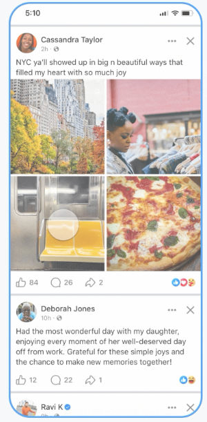 Meta sa sústredila, na to, aby bol Facebook ešte prehľadnejší a mohli ste ľahšie reagovať na príspevky. Napríklad pri sledovaní príspevku s fotografiami budú štandardne zobrazené v mriežke po štyroch. Fotografie tak nielen lepšie uvidíte, ale budete ich môcť aj jednoduchšie „lajkovať“ bez nutnosti prechádzať každú fotku samostatne. Dvojité ťuknutie na konkrétnu fotku alebo obrázok pridá znak „Páči sa mi“.