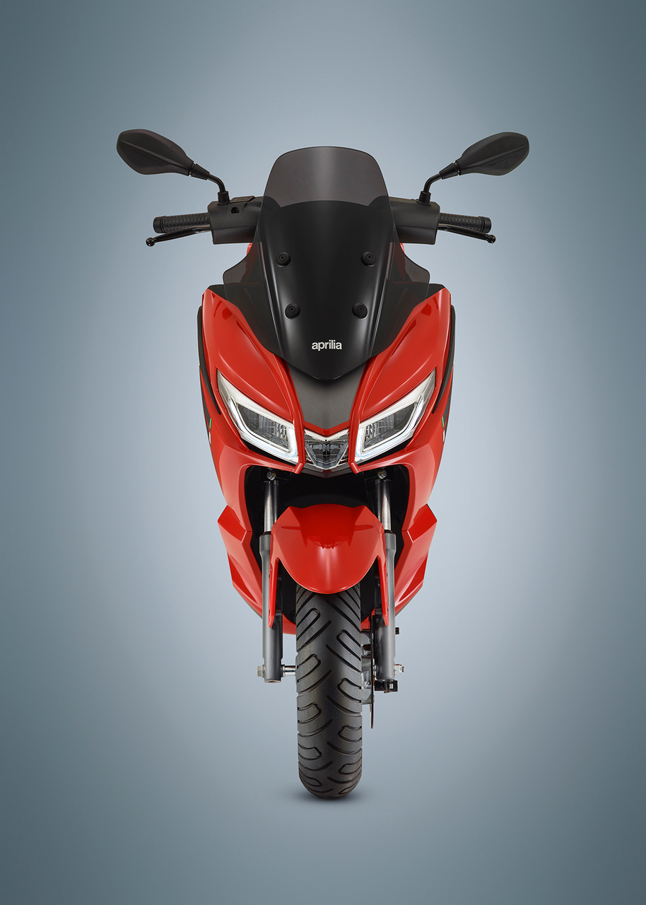 Dizajn Aprilie SXR 50 je veľmi podarený – prednej časti dominuje veľká kapotáž s LED svetlometom uprostred. Duálny svetlomet je vo zvislej osi rozdelený tretím prvkom a jasne tak odkazuje na dizajn trojitého svetla, používaného v rámci športových motocykloch Aprilia. V prednom svetlomete sú zabudované LED svetlá denného svietenia i smerovky. Vysoké riadidlá a plexištít zabudovaný do prednej kapotáže dodávajú motocyklu vzhľad väčšieho GT skútra a zároveň zaisťujú pohodlnú jazdnú pozíciu a ochranu jazdca.