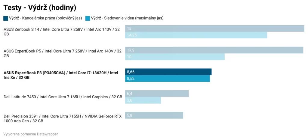 Testovaná konfigurácia ponúkala 63 Wh batériu. Výdrž notebooku hodnotím na dnešné pomery ako priemernú. V porovnaní s modelom ExpertBook P5, ktorý využíva energeticky efektívnejší procesor, bola polovičná. Konkrétne som nameral vyše 8,5 hodiny kancelárskej práce s polovičným nastavením jasu, resp. sledovania videa s maximálnym nastavením jasu.