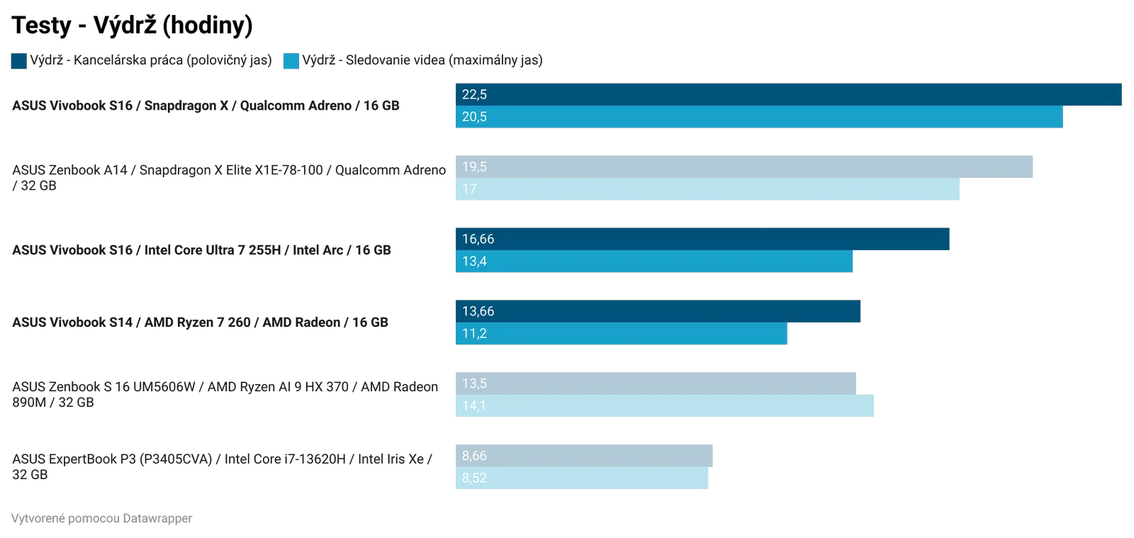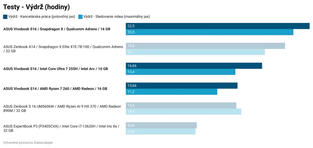 Jediná oblasť, kde Intel nedosiahol prvenstvo, je výdrž batérie. Všetky notebooky ponúkajú 70 Wh batériu a výdrž batérie je silná stránka čipu Qualcomm Snapdragon X. Ak pravidelne sledujete, čo sa deje vo svete notebookov, potom vás táto informácia neprekvapí.