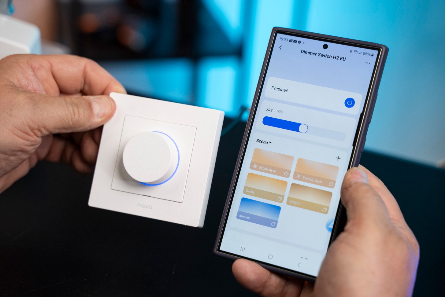 AQARA Dimmer Switch H2 EU je otočný stmievač s podporou Zigbee a Thread. Ak máte na tento stmievač napojený napr. luster, môžete nastaviť intenzitu svetla buď fyzickým gombíkom na zariadení alebo cez aplikáciu. Rovnako sa dá pripojený spotrebič celkom vypnúť alebo zapnúť.