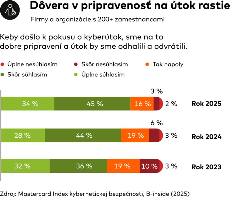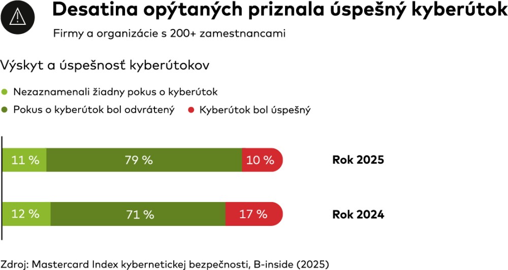 Kyberútoky dnes už nie sú otázkou „či“, ale „kedy“. Nový Mastercard Index kybernetickej bezpečnosti ukazuje, že až deväť z desiatich slovenských firiem alebo organizácií sa s nimi už stretlo. Digitálne riziká sa tak stávajú rovnako bežnou súčasťou podnikania ako účtovníctvo či marketing. Podľa indexu získal firemný sektor 63 bodov zo 100, čo naznačuje slušnú pripravenosť. Najlepšie výsledky dosiahli veľké spoločnosti a štátne inštitúcie, zatiaľ čo menšie firmy a e-shopy ešte stále hľadajú cestu, ako sa lepšie chrániť.
