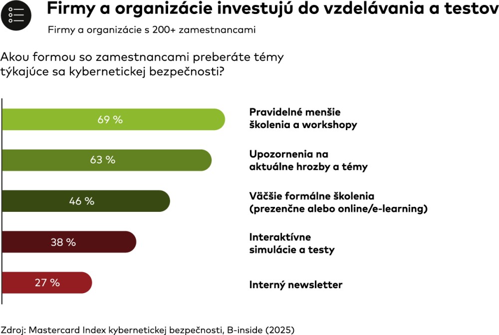 Najzraniteľnejším miestom však stále zostáva človek. Väčšina úspešných útokov sa začína cez zamestnancov, ktorí dokážu nevedomky kliknúť na falošný e-mail, prípadne zdieľajú údaje. Firmy to však už vnímajú ako problém, preto 7 z 10 organizácií robí pravidelné školenia a workshopy, informuje o nových hrozbách či podporuje zodpovedné správanie v online prostredí.