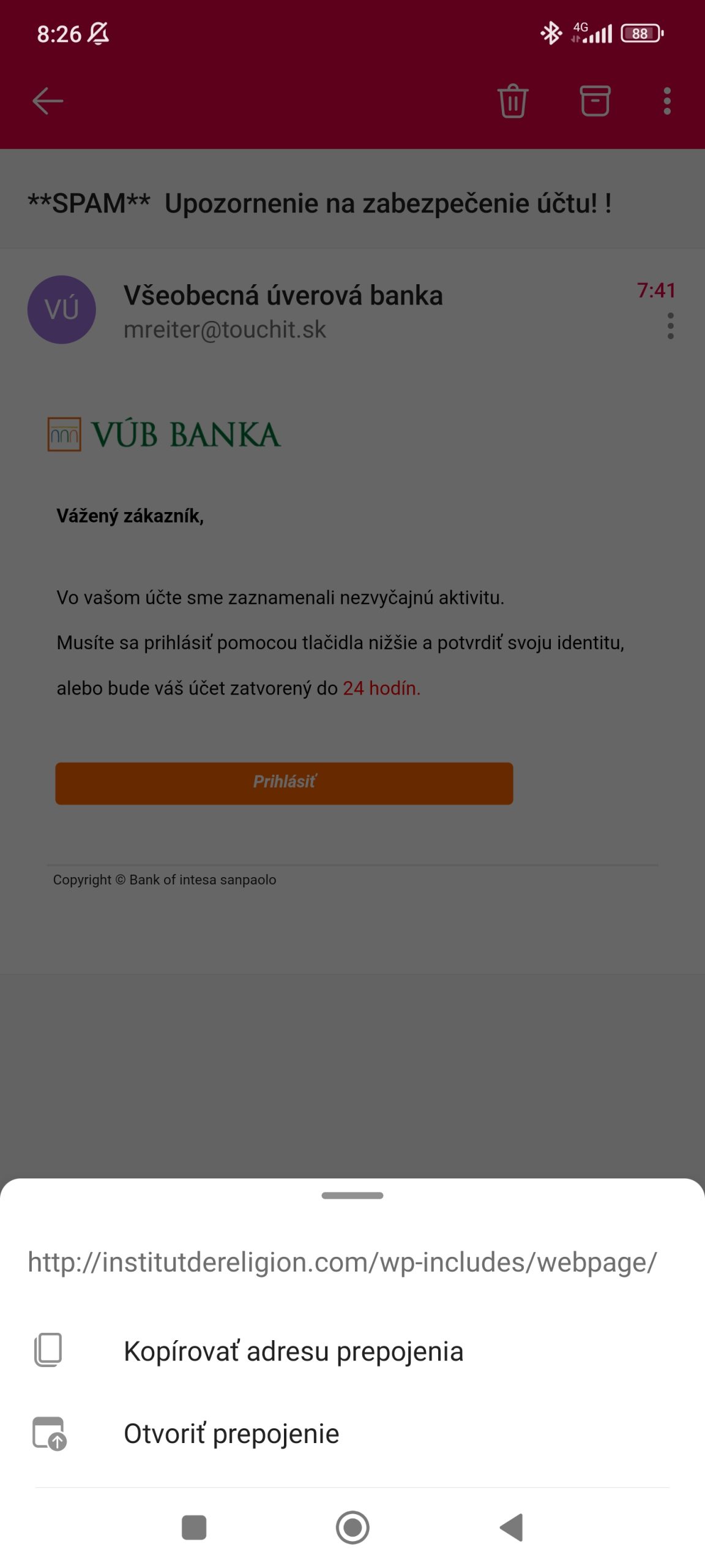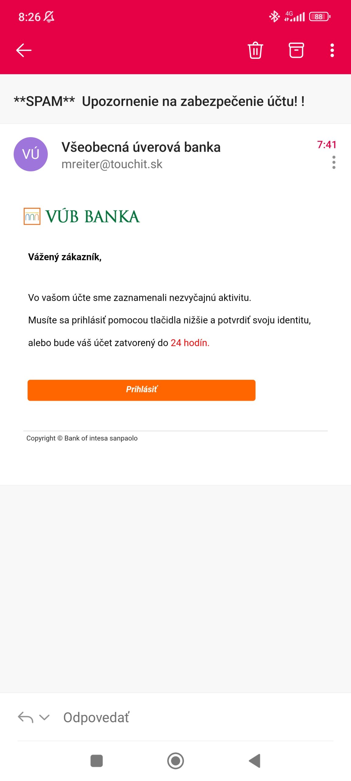 Najnovšie sa k podvodu pripája falošný email vydávajúci sa za správu zo Slovenskej Sporiteľne. Emailový klient ho vopred označí za spam, no treba aj vašu pozornosť. V našom prípade to bolo jednoduché, keďže účet v tejto banke nemáme.
