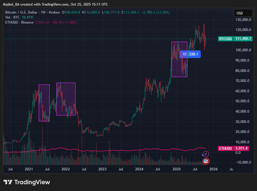 Aby toho nebolo málo, stále sa objavujú správy (viac želania), že Bitcoin dosiahne do konca roka hodnotu 200 – 250 000 dolárov. Vtedy by korekcia o polovičnú hodnotu znamenala pokles približne na 125 000 USD. Pre porovnanie s minulosťou – Bitcoin takéto poklesy zaznamenal koncom januára 2022, keď klesol približne o 50 % na hodnotu 35 000 dolárov. Pokles zo sumy 69 000 USD mu nezabral ani 3 mesiace.