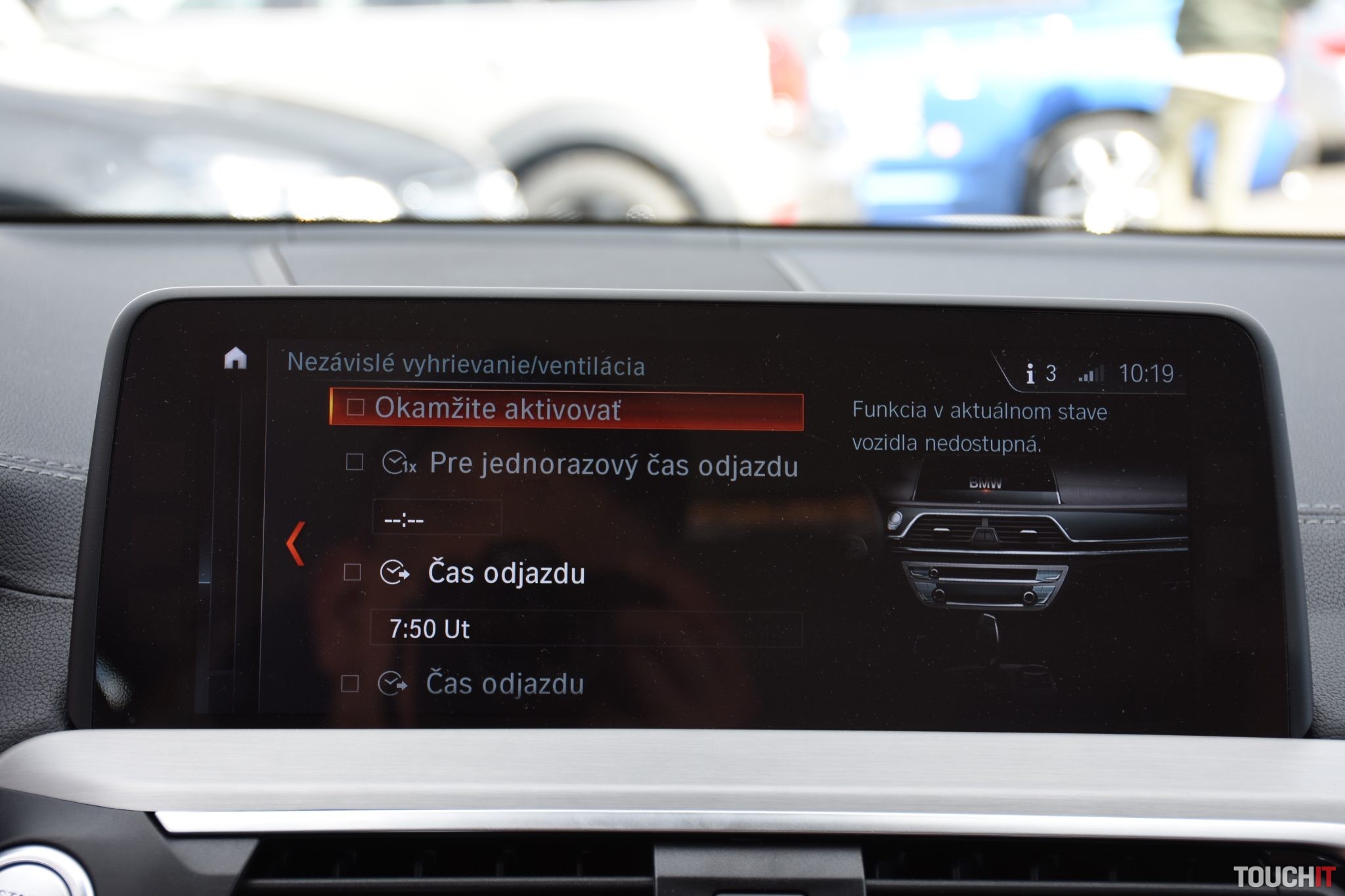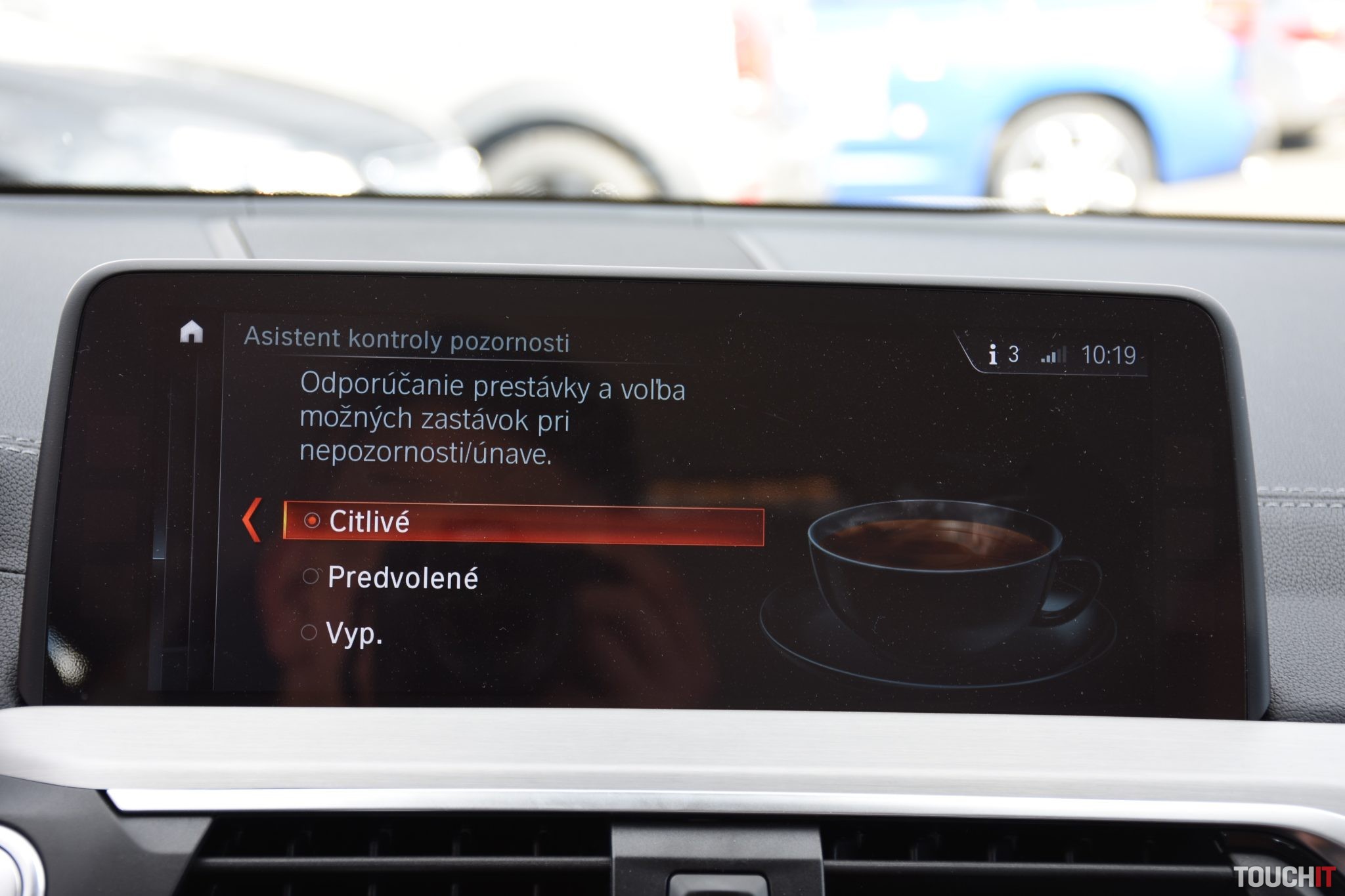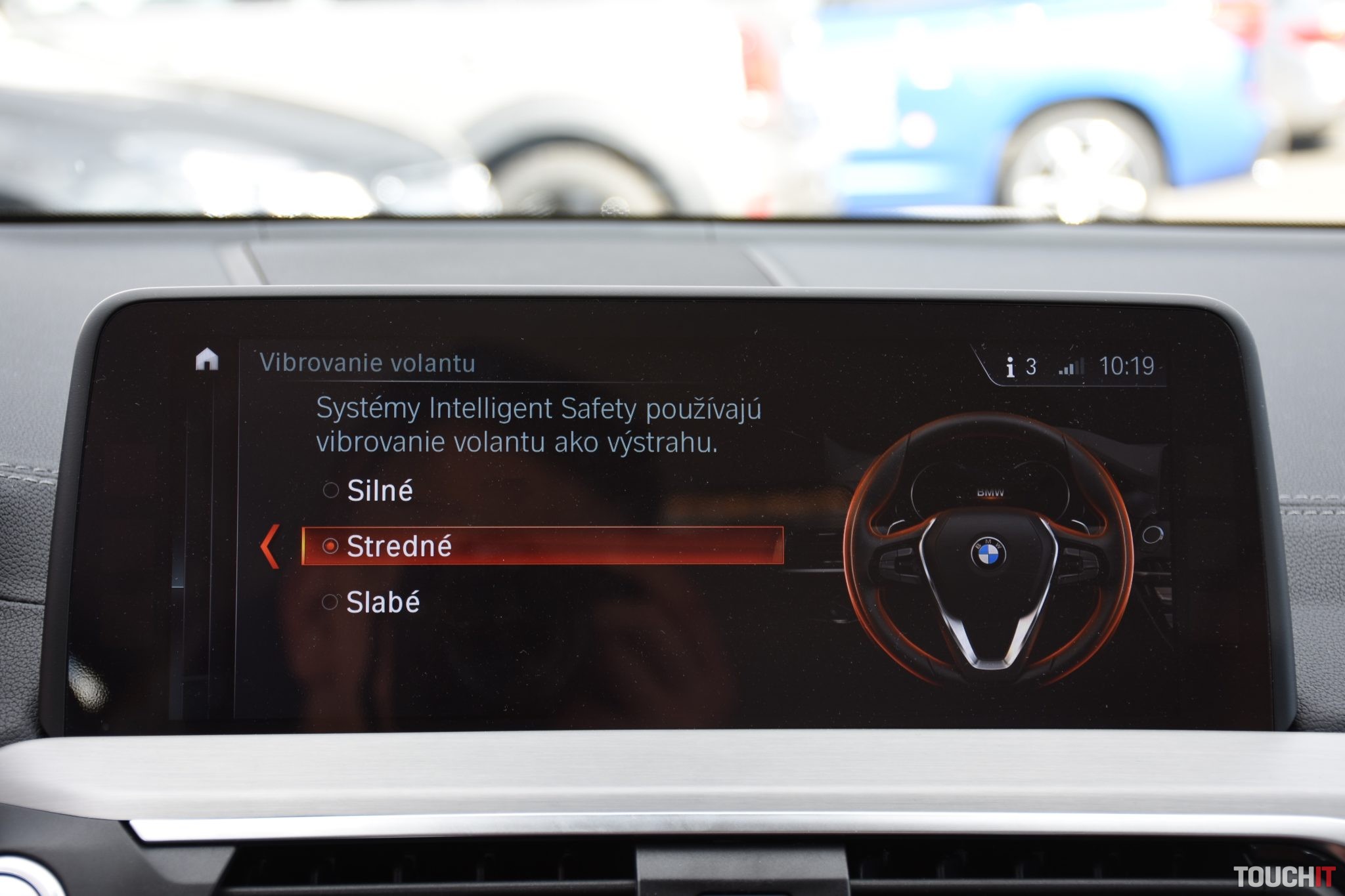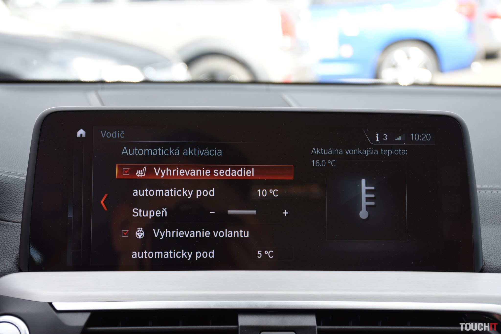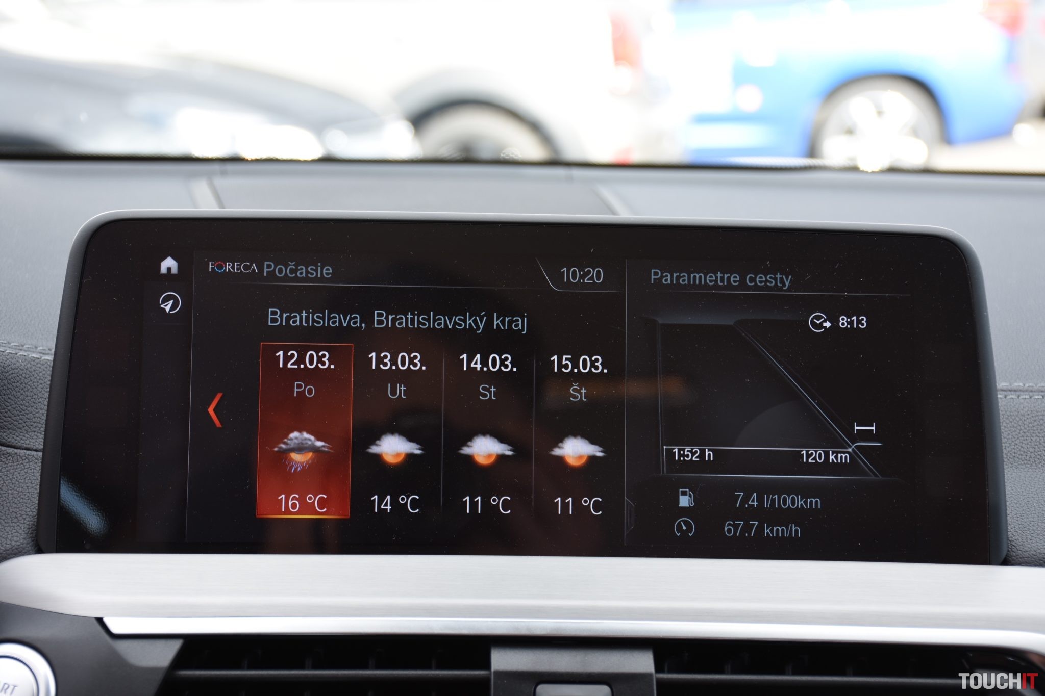 Zadné sedadlá sú na tom podobne, ale pohodlne sa budú cítiť iba pasažieri strednej postavy. Vyšší a objemnejší pasažieri budú mať menej miesta nad hlavou a pred kolenami. Ak si objednáte príplatkovú panoramatickú strechu, tak bude strop ešte o niečo nižší. X3 je 5-miestna, ale ak chcete zachovať maximálnu dávku komfortu, tak iba 4-miestna. Na krajných sedadlách nechýbajú isofix úchyty a možnosť polohovania operadla. Nastavenie je za pomoci páčky pri dverách, čo je praktické. Z komfortných prvkov nechýba vyhrievanie sedadiel (predných + zadných krajných), a tiež vyhrievanie príplatkové M volantu, ktorý fantasticky padne do rúk (+ 207 eur). Vyhrievanie môže byť aktivované aj automaticky – podľa aktuálnej teploty. Kruh uzatvára balík Ambient Air, teda integrované vône s nastavením intenzity (+ 331 eur), ambientné podsvietenie interiéru s možnosťou zmeny farby a galvanizované ovládače (zvýšenie odolnosti a lesku + 155 eur). Počas jazdy som ocenil výborné odhlučnenie kabíny, na čom majú zásluhu aj akustické sklá. Predné akustické sklo je v základe, bočné sú za príplatok. Batožinový priestor má zachovanú kapacitu – 550 L. Po sklopení operadiel v druhom rade (delenie 40:20:40) získate objem s kapacitou 1600 L. Operadlá sú sklápateľné z kufrovej časti a majú spomalený chod, aby sa predišlo nehodám. Batožinový priestor obsahuje viacero praktických prvkov – koľajnice s posuvným okom, výsuvné háčiky na tašky a 12V zásuvku. Pod podlahou sa nachádza ďalší priestor na odkladanie menších predmetov. Podlaha, ktorá delí hlavnú časť od tej spodnej, obsahuje plynovú vzperu a drží samostatne, čo chválime. Samozrejmosťou je krycia roleta, ako aj bezpečnostná sieť. Obe sa dajú skryť pod kryt do podlahy. Veko batožinového priestoru je ovládané automaticky – tlačidlom na veku, tlačidlom pri šoférovi alebo podkopnutím nohou. X3 je z pohľadu priestoru dostatočne veľké vozidlo pre bežnú rodinu, ale! Opäť platí, že kvôli dizajnu a aerodynamike trpí kufor, ktorý je pomerne nízky. Napr. pri nakladaní väčšieho kočíku s vaničkou to môže byť problém. Komfortná výbava Testovaná X3 obsahovala všetko podstatné, od vyhrievania všetkých sedadiel, až po 3-zónovú automatickú klimatizáciu (2-zóny vpredu / 1-zóna vzadu). Na zadných oknách sú manuálne vysúvateľné sieťky, vnútorné spätné zrkadlo má funkciu automatického stmavenia a nechýbajú ani automaticky sklápateľné spätné zrkadlá. 12V zásuvky sú celkom tri – vpredu, vzadu a v kufri. Pasažieri v zadnej časti by určite ocenili aj menič napätia (230 V zásuvku) a aspoň 2 USB vstupy, ktoré majú absenciu. Počas testu som ocenil dostatočné množstvo odkladacích priestorov a pohodlnú lakťovú opierku. Medzi bežné prvky patrí elektrické ovládanie všetkých okien, airbag spolujazdca s možnosťou deaktivácie, kontrola tlaku v pneumatikách a komfortný prístup (bezkľúčové – otváranie, zatváranie, štartovanie). Nechýba ani vonkajšie podsvietenie kľučiek a priestoru pri aute, aby ste vedeli kam stúpite. Svetlo na efektný pásikový lúč a vychádza z prahov. Praktickým doplnkom je bezdrôtová Qi nabíjačka v stredovej konzole, kde nabíja nie len telefón, ale aj kľúč od auta. Áno, kľúčik s displejom má už aj nová X3. Na kľúči vidíte všetky podstatné informácie o aute, či sú zatvorené okná, dvere a aký je stav palivovej nádrže. Vo výbave bola aj nezávislá klimatizácia a vykurovanie, ktoré je možné pomocou tohoto kľúča vzdialene aktivovať alebo naplánovať rôzne dni a časy, kedy sa má spúšťať. Za toto sa priplatiť oplatí, oceníte to v lete i v zime. Oproti vyšším modelovým radom má absenciu funkcia automatického vyparkovania bez šoféra. Pred vodičom dominuje 12,3“-palcový digitálny prístrojový panel, ktorý vyniká výbornou grafikou a dobrou čitateľnosťou. Okrem budíkov sa tu zobrazujú všetky podstatné informácie o vozidle, jazde, asistenčných systémoch a navigácii. Pri zmene jazdného režimu sa mení celá grafika do prednastavených profilov. Nevýhodou je, že aj keď je plne grafický, tak nie je konfigurovateľný a nedá sa na ňom zobraziť napr. celá mapa navigácie. Namiesto toho je prítomný obrovský head-up displej, ale i tak by sme túto možnosť privítali. Head-up displej je od základu vynovený, ponúka diametrálne väčšiu zobrazovaciu plochu a je plne farebný. Viditeľnosť je nadštandardná, pričom zobrazuje všetky údaje o jazde, aktívnych systémoch, navigácii, médiách a pod. Samozrejmosťou je nastavenie polohy zobrazenia a jasu. Komfortnú zónu ukončíme multifunkčným volantom, ktorý obsahuje všetky podstatné prvky (asistenčné systémy/multimédiá). Vymenili by sme iba ovládanie hlasitosti z pravej strany na ľavú. Adaptívne LED svetlomety Rukami dizajnérov prešla aj svetelná technika. Vpredu sú príplatkové – adaptívne Full LED svetlomety, ktoré majú zmodernizovanú grafiku. Nechýba im ani denné svietenie („angeleyes“) v tvare hexagonu. Adaptívne LED svetlomety niečo stoja, ale oplatí sa do nich investovať. Ak jazdíte veľa a hlavne večer, určite oceníte ich vysokú svietivosť, dosah, automatické prepínanie (stretávacie/diaľkové), natáčanie do zákrut a vykresľovanie/vyrezávanie vozidiel oproti vám alebo pred vami. Jednotlivé LED segmenty riadi elektronika, ktorá dostáva informácie z kamier a senzorov, pričom dokáže účinne a veľmi rýchlo reagovať na aktuálnu situáciu. Nočné jazdy ma presvedčili o tom, že tieto svetlá patria k jedným z najlepších v danej triede. Pod hlavnými svetlometmi sa nachádzajú hmlové LED svetlá s funkciou prisvietenia zákrut. Zadné obrysové svetlá sú tiež inovované a zaujali ma svojim svetelným podpisom. Ich svietivosť 