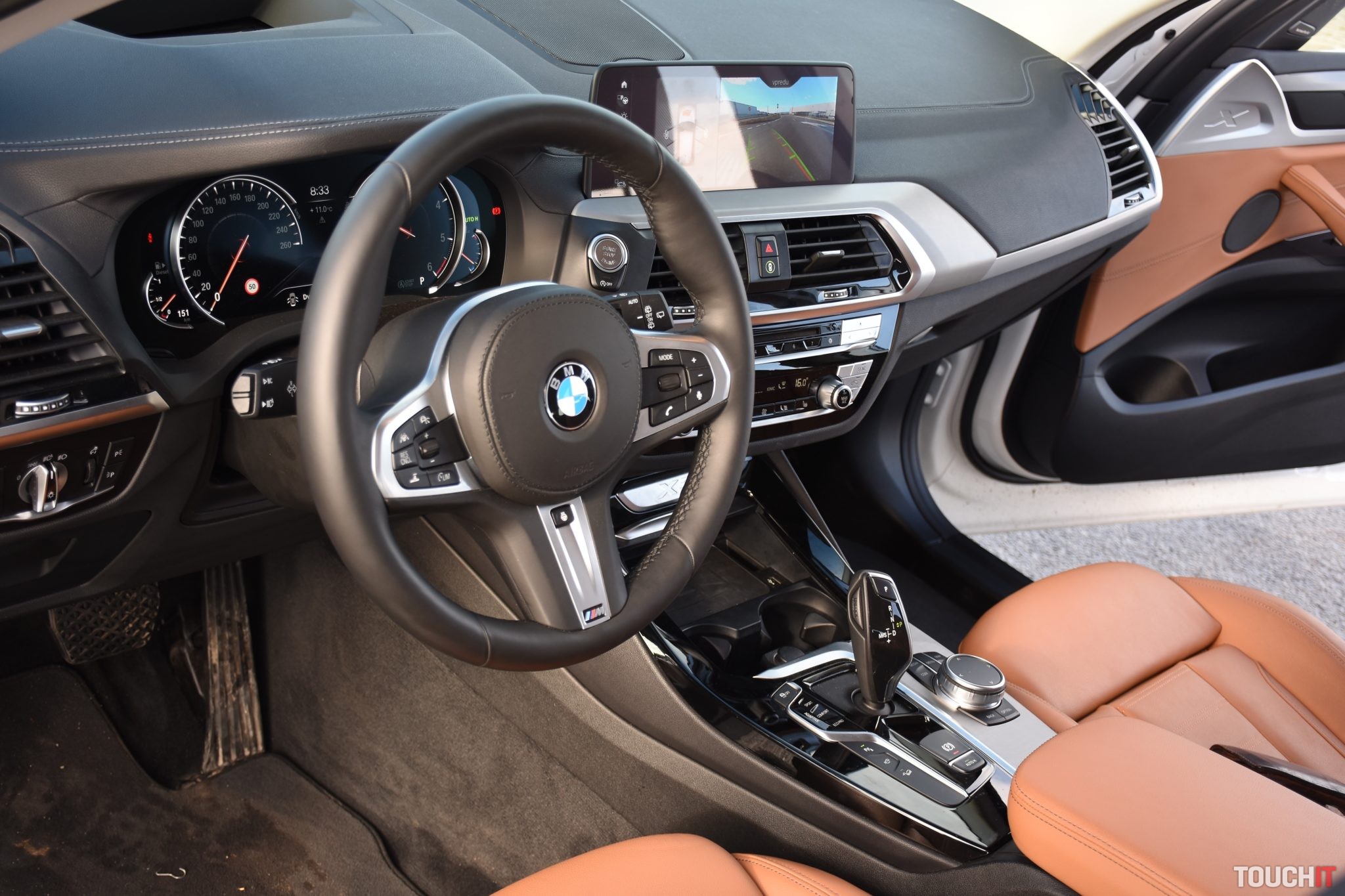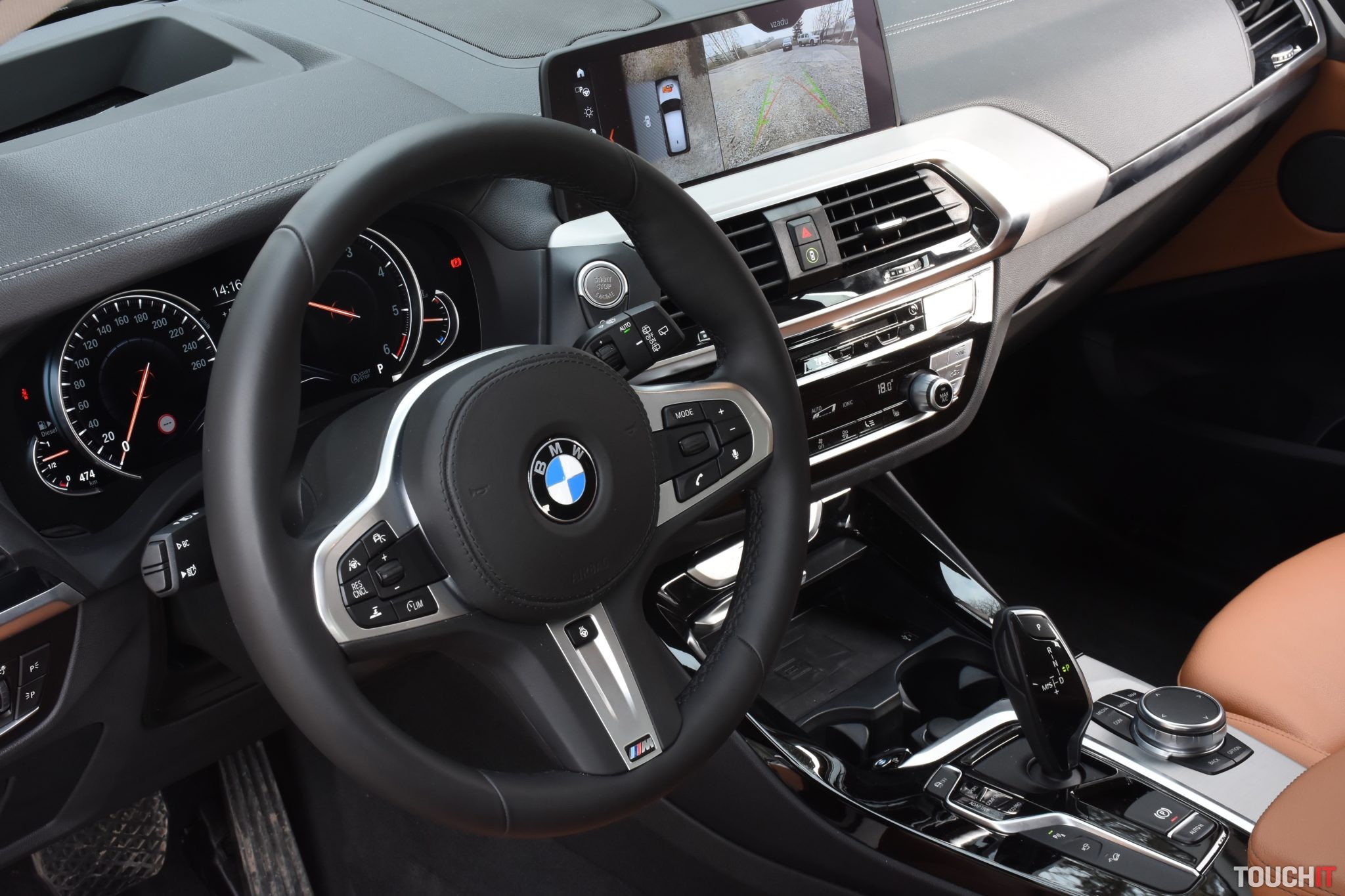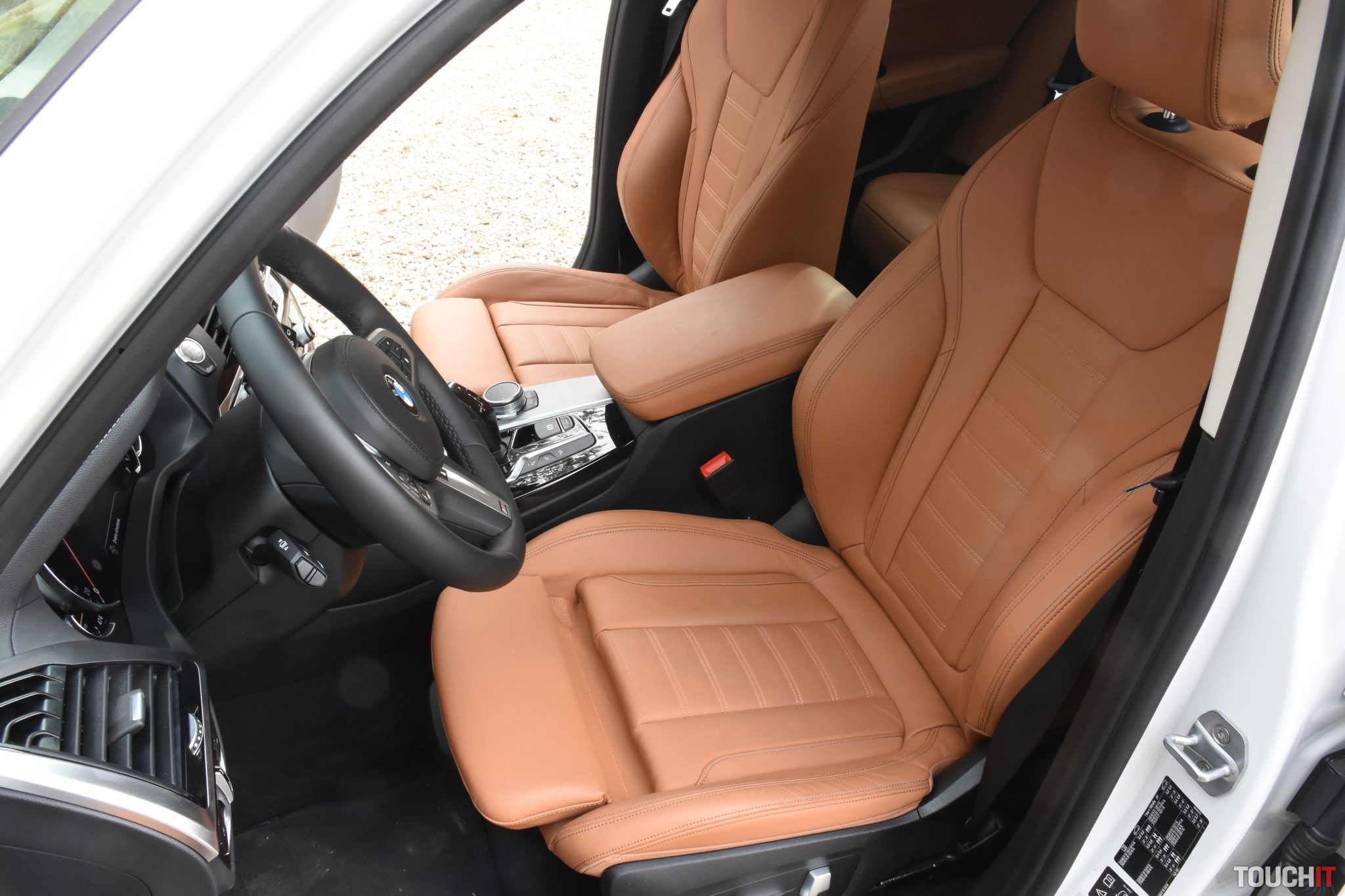 Po nahliadnutí do interiéru okamžite zistíte, že toto nie je tá klasická X-trojka. Všade sú použité prémiové materiály a kvalita vyhotovenia je v danej triede na vysokej úrovni. V interiéri vyniknú pozdĺžne brúsené hliníkové lišty – Pearl Chrome (+ 145 eur) a občas na vás vykukne aj klavírny lak. Palubná doska vyzerá ako by bola prešívaná kožou, ale nie je tomu tak. Je to imitácia z mäkčeného plastu, ale vyzerá dobre. Praktické rozloženie ovládačov a orientácia celého systému na vodiča je pre BMW synonymom a verím, že to tak ostane navždy, teda pokiaľ budú šoférovať ľudia. BMW pred časom vymenilo aj dodávateľa kože, čo je poznať min. na sedadlách. Koža je jemnejšia a mala by byť aj odolnejšia. V testovanom vozidle boli športové sedadlá v krásnej hnedej koži s dekoratívnym prešívaním – Vernasca Cognac (+ 1406 eur). Sedadlá sú pohodlné aj pri dlhšom cestovaní a z auta sme ani raz nevystúpili vyslovene unavení. Predné sedadlá sú plne elektrické, vodičove aj s pamäťou – 2 polohy. Páči sa mi celkový posed, ergonomický tvar a výraznejšie bočné vedenie s dofukovaním v bedrovej, resp. chrbtovej časti.