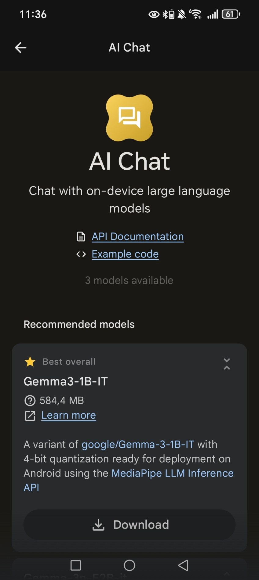 Potom sa sprístupní stiahnutie. Ak máte priamy link, pokojne ho použite a súbor s modelom stiahnite do smartfónu. Edge Gallery dokáže tento súbor importovať aj z lokálneho zdroja.