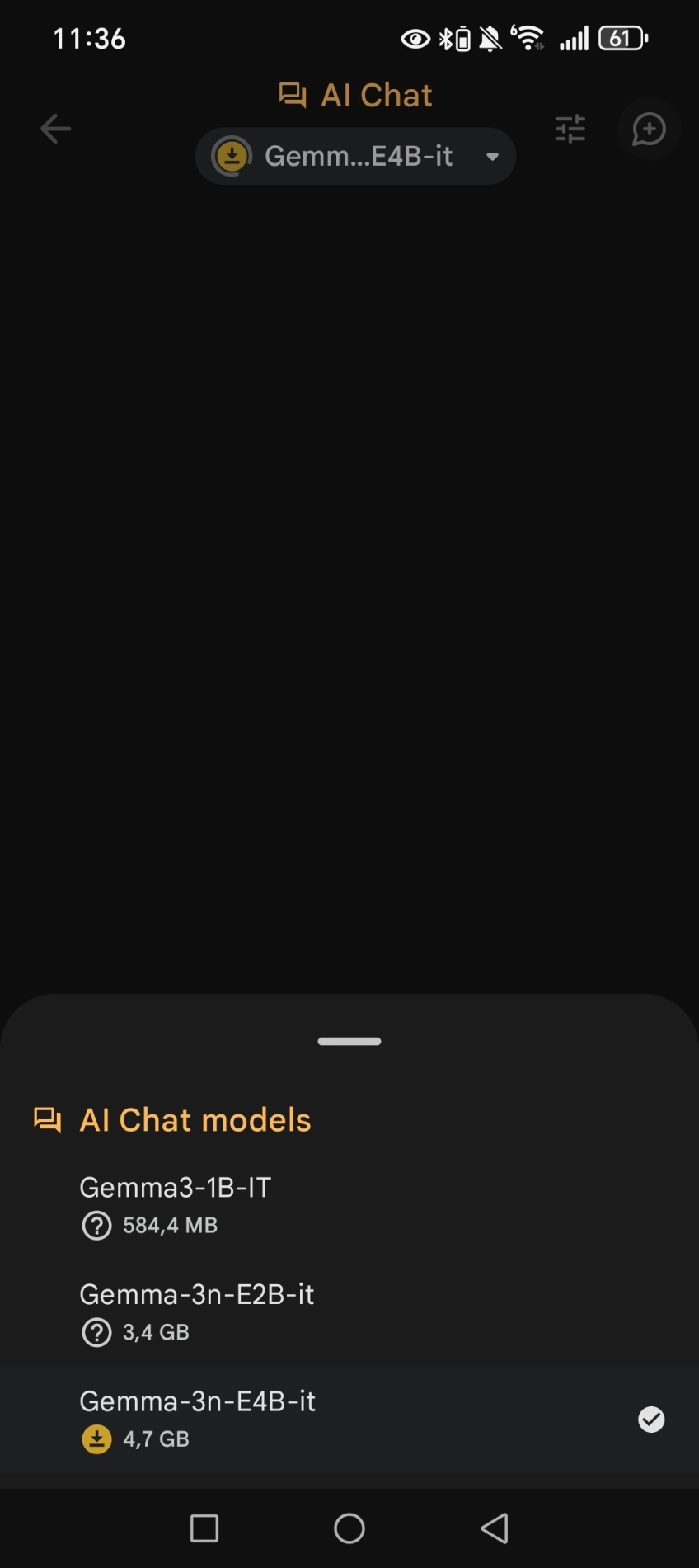 Základná obrazovka obsahuje rozdelenia podľa spôsobu využitia modelu. Gemma sa dá použiť nielen na chatovanie ale aj na generovanie obrázkov. Stačí ho stiahnuť a následne bude prístupný pre ostatné režimy použitia.