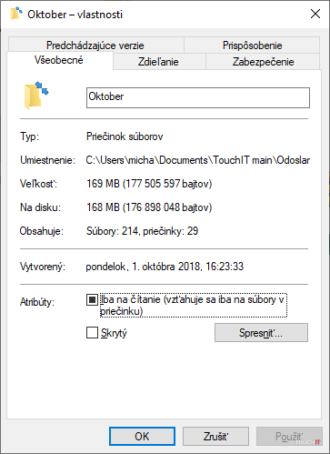 Tlačidlom Spresniť sa zobrazia detaily – okno Rozšírené atribúty. Voľbou Komprimovať obsah a ušetriť miesto na disku a potvrdením tlačidlom OK sa uplatnia zmeny. Tlačidlom OK v predchádzajúcom okne spustíte kompresiu súborov. Kompresia nie je príliš silná a viac miesta dokážete ušetriť použitím silnejšej kompresie cez spomínané nástroje. Avšak je to menej pohodlné, pretože súbory potom treba ručne rozbaliť a nedeje sa všetko na pozadí. Silnejšia kompresia by bola príliš náročná na výkon CPU a strácala by praktický význam. Preto je táto vstavaná možnosť v súborovom systéme NTFS vhodnejšia z každodenného používať. V praxi pravdepodobne ani nepocítite, že máte súbory komprimované. Neodporúčame: Komprimovanie celého disku C. Zvýši sa zaťaženie CPU a disku a systém sa môže citeľne spomaliť. Prečítajte si aj: https://touchit.sk/ako-zmenit-pozadie-na-obrazovke-uzamknutia-vo-windows-10/194772Podobné články