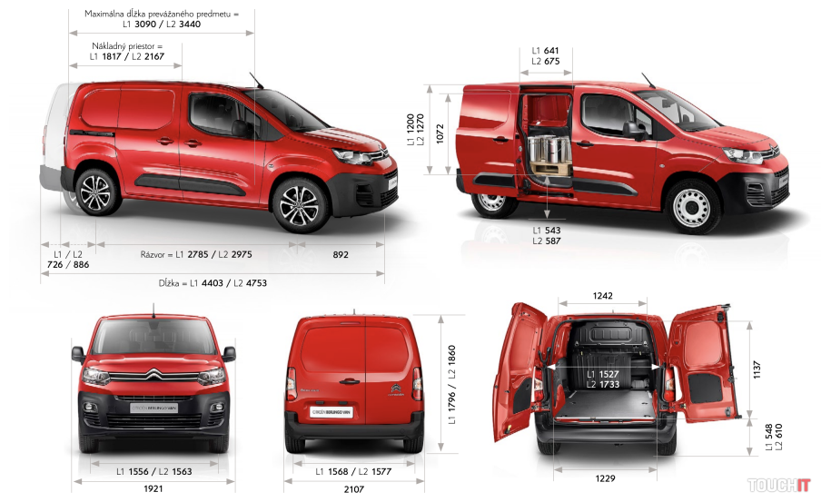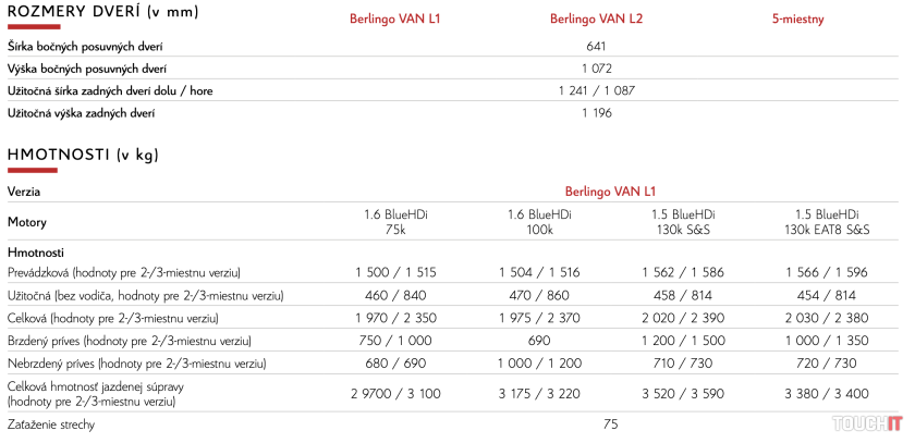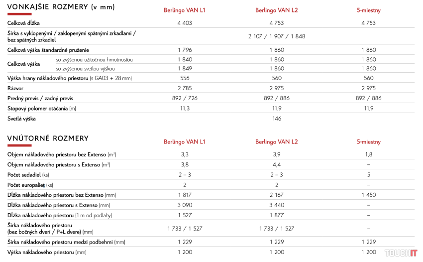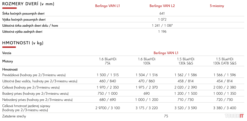 Z príplatkovej výbavy sme mali k dispozícii balík – zlé cesty, ktorý ponúka viacero prvkov. Základom je zvýšená svetlá výška o 30 mm, ochranný kryt pod motorom, širšie kolesá (690 mm) s pneumatikami Mud&Snow a systém Grip Control s asistentom zjazdu z kopca (Hill Assist Descent). Grip Control mení pohyblivosť, resp. trakciu predných kolies podľa daného terénu. Skúšal som režim sneh v menších závejoch a bolo to fajn, ale reálne to môže (trošku) pomôcť až v náročnejších podmienkach, inak veľký rozdiel nebadať. Z pohľadu komfortu jazdy ide o dobre spracovaný podvozok, ktorý pekne filtruje nerovnosti, ale ľahší zadok občas cítiť odskočením. Je to však „dodávka“, takže je to v poriadku. Hlučnosť v kabíne je primeraná, nič, čo by vyrušovalo. Auto malo oceľové disky s poriadnym obutím, s ktorým sa nemusíte báť takmer žiadneho povrchu (215/65/R16/C). Výška pneumatiky tiež zaručuje určité tlmenie a komfort. Ešte dodám, že pod ložnou plochou je plnohodnotné rezervné koleso. Technológie, komfort a asistenčné systémy Áno, aj pracovná verzia Berlinga disponuje prvkami technológií a asistenčnými systémami. Ak si priplatíte, tak vám ponúkne množstvo zaujímavých technológií, ktoré by ste tu pravdepodobne nečakali. V našom prípade to bol dobre použiteľný stred. Začnem 1-zónovou manuálnou klimatizáciou, elektrickým ovládaním okien, vyhrievaným sedadlom vodiča a rozdeleným uzamykaním (kabína/ložná plocha), čo je praktický doplnok. Ďalej je tu elektronická parkovacia brzda, airbag spolujazdca s možnosťou vypnutia, sledovanie pozornosti vodiča a asistent rozjazdu/zjazdu do/z kopca. Ocenil som aj tempomat s obmedzovačom rýchlosti. Prekvapil ma predný a zadný parkovací asistent doplnený o parkovaciu kameru s navádzacími čiarami a výborným rozlíšením. Obraz z kamery sa zobrazuje na 5“ displeji, ktorý je na mieste vnútorného spätného zrkadla. Praktické riešenie. Z multimédií je prítomný základný panel, ktorý ponúka Bluetooth konektivitu (prekvapivo rýchla komunikácia) a nechýba ani jeden USB-A port a 3,5 mm audio konektor (ovládanie multimédií pod volantom). O audio „zážitok“ sa starajú 4 reproduktory. Praktickým doplnkom (za príplatok) je aj 220V zásuvka priamo v kabíne (menič – 120 W/50 Hz). Hodnotenie TOUCHIT Nezvyčajný, ale o to intenzívnejší test pracovného Berlinga dopadol nad očakávania. Ide o výborne riešené auto, ktoré ponúka praktické prvky, nezvyčajné konfigurácie a veľmi dobré jazdné vlastnosti. To všetko je podčiarknuté dobrým motorom, ktorý splnil očakávania. Má výkon, kultivovaný chod a slušnú spotrebu. Nové Berlingo Furgon je úžitkové vozidlo roku 2019 a ja nemôžem nesúhlasiť. Citroën má v tomto segmente dlhoročné skúsenosti a tradíciu, čo sa odzrkadluje na každom novom modely a riešeniach, ktoré tieto autá ponúkajú. Základná technická špecifikácia: Citroën Berlingo Furgon (CLUB)- Motor: 1499 cm3 / 4-valec