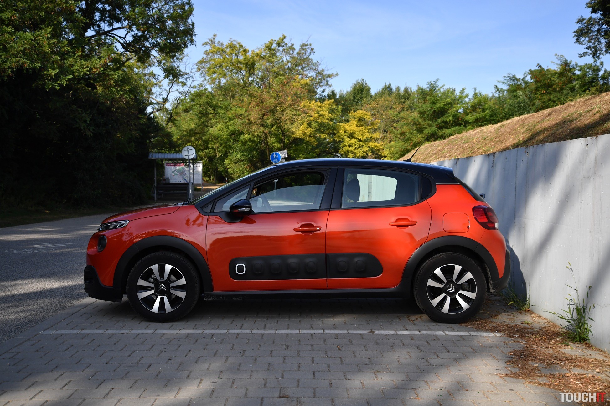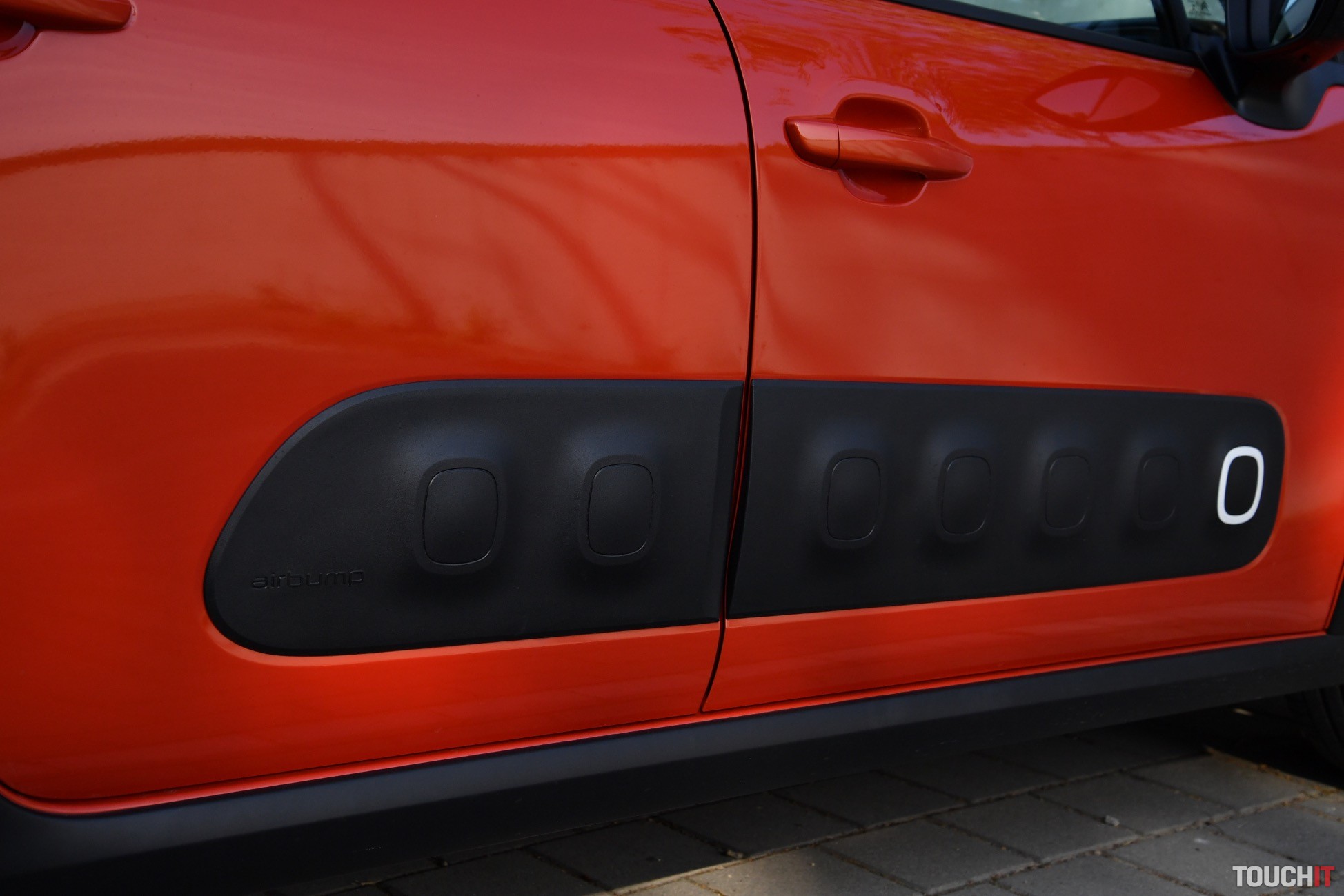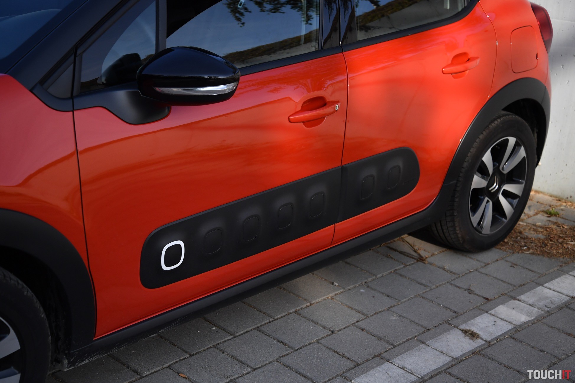 V podstate je to jedno, nová C3 vyzerá veľmi dobre, je svieža a energická. Testovaný model si ma získal aj farebným prevedením – oranžový (POWER) základ je pretkaný čiernymi (ONYX) doplnkami, čo vo výsledku vyzerá veľmi dobre (farebných kombinácií je až 36). Čierna je aj strecha, ktorá má v strede efektný prelis. C3 nie je autom, ktoré zapadne do davu, je výrazná a tak jej to pristane. Síce nejde o crossover, ale sú tu určité prvky, ktoré to môžu evokovať. Spodok karosérie chránia plastové lemy, ktoré sú doplnené o Airbump nárazníky po oboch stranách. Tie prechádzajú od predných dverí na zadné a ich úlohou je chrániť dvere pred poškodením. Na preplnených parkoviskách to určite oceníte. Ako celok pôsobí C3 veľmi dobre, ale nie každému takýto výrazný dizajn vyhovuje.