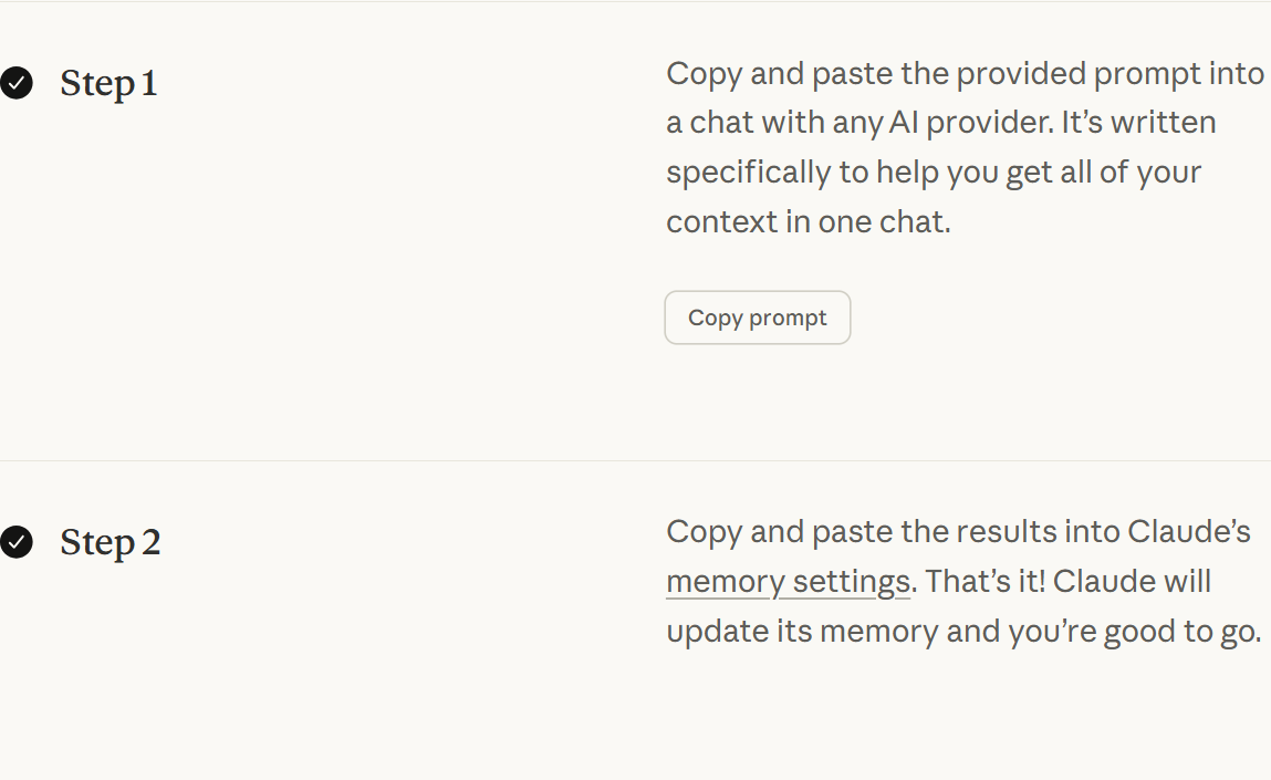 Novinka umožňuje importovať preferencie a pracovný kontext z iných AI nástrojov skopírovaním príkazu na to určeného. Hlavnou výhodou je zachovanie dlhodobo vytváraného kontextu. Ak ste mesiace učili inú AI, ako pracujete, aký štýl preferujete alebo na akých projektoch pracujete, tieto informácie teraz môžete ľahko preniesť inde.