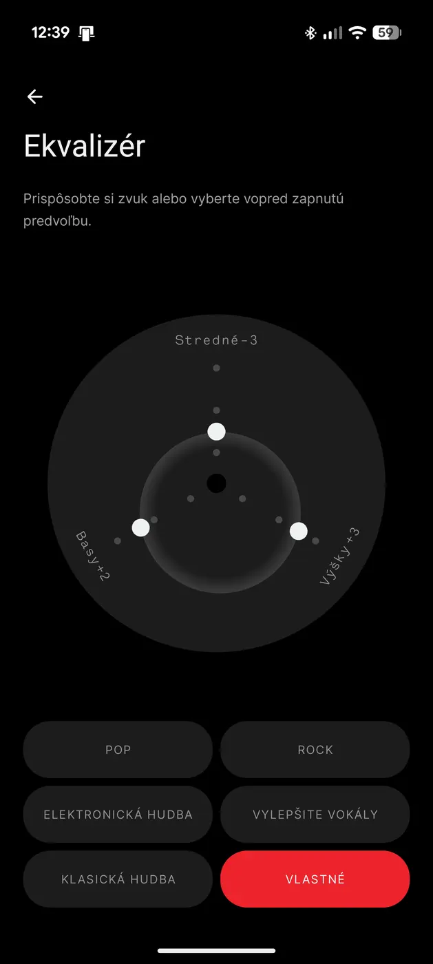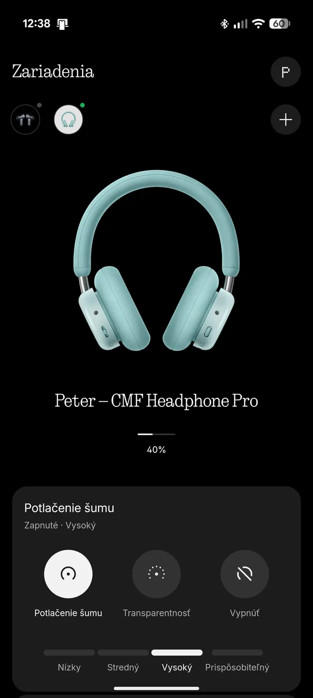 Vo výbave CMF Headphone Pro sa nachádzajú aj zaujímavé a hlavne funkčné ovládacie prvky. Tradičné “Nothing” ovládacie koliesko slúži na ovládanie hlasitosti, prehrávanie aj nastavenie ANC alebo Transparentného režimu. Už na začiatku používania ma však zaujal Energy Slider, ktorý v závislosti od nastavení okamžite upravuje basy a výšky v reálnom čase. To som ocenil pri striedaní podcastov a počúvaní hudby, keď som si okamžite nastavil zvukový prejav na základe prehrávaného obsahu.