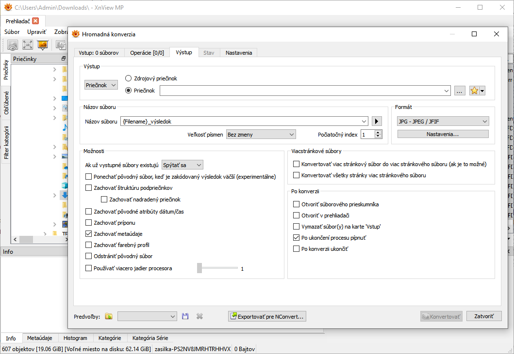 Pokiaľ sa rozhodnete pre druhú možnosť, otvorenú HEIC fotografiu si môžete rýchlo uložiť do iného formátu cez menu Súbor/Uložiť ako (vyberte formát JPG – JPEG/JIFF). Pokiaľ chcete takto skonvertovať niekoľko desiatok alebo stoviek fotografií naraz, kliknite v menu programu na Nástroje/Hromadná konverzia. V otvorenom okne kliknite na záložku Vstup, kde všetky HEIC fotografie pretiahnite myšou. Na záložke Výstup potom nastavte formát JPG – JPEG/JFIF a kliknite na tlačidlo konvertovať. Počas krátkej chvíľky sa vedľa HEIC súborov vytvoria ich kópie vo formáte JPEG.