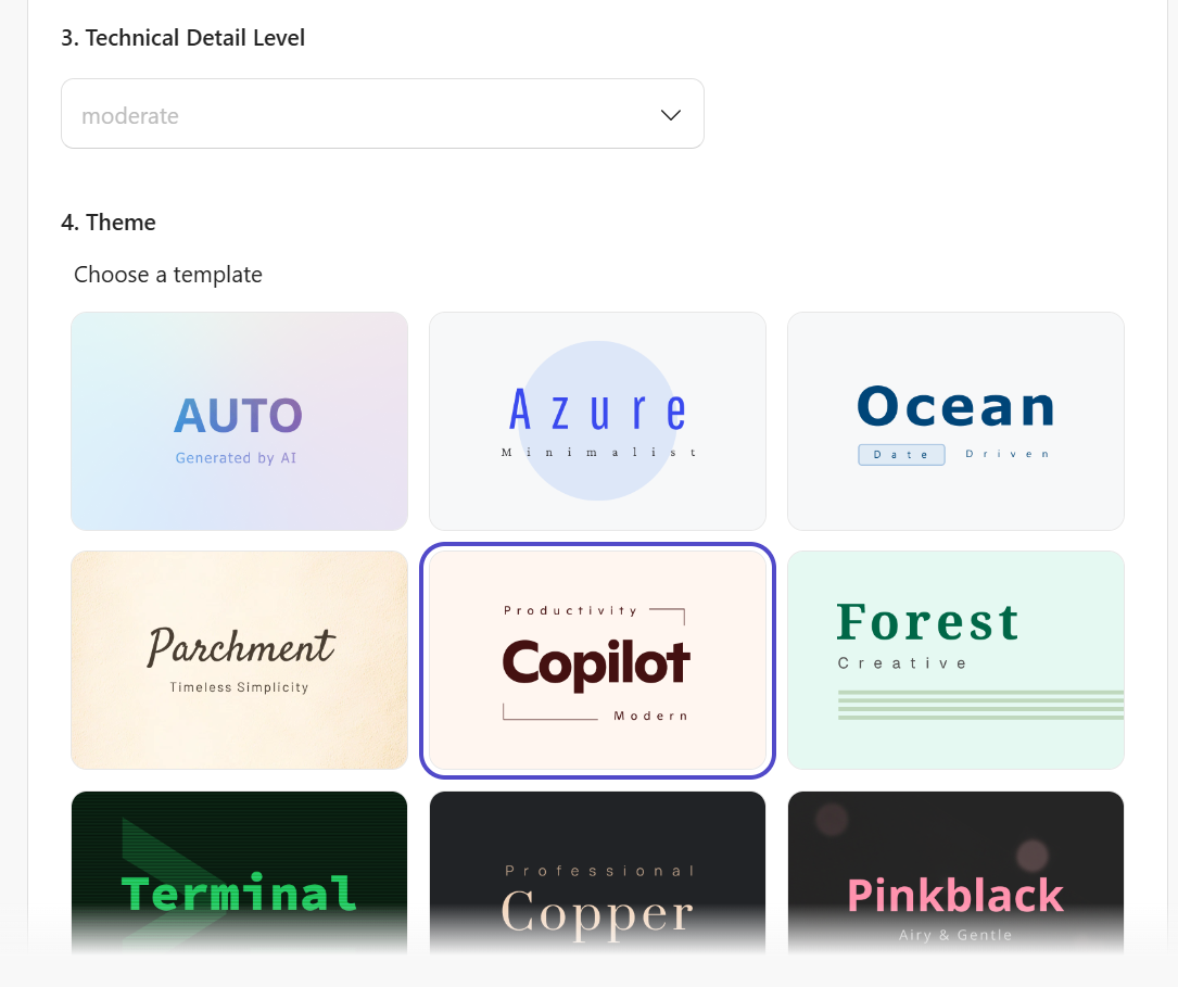 Najprv vytvorí osnovu, ktorú budete vopred vidieť a na základe nej bude ďalej postupovať. Pri prezentáciách sa v počiatočnej fáze používateľa opýta, aký grafický štýl chce zvoliť.