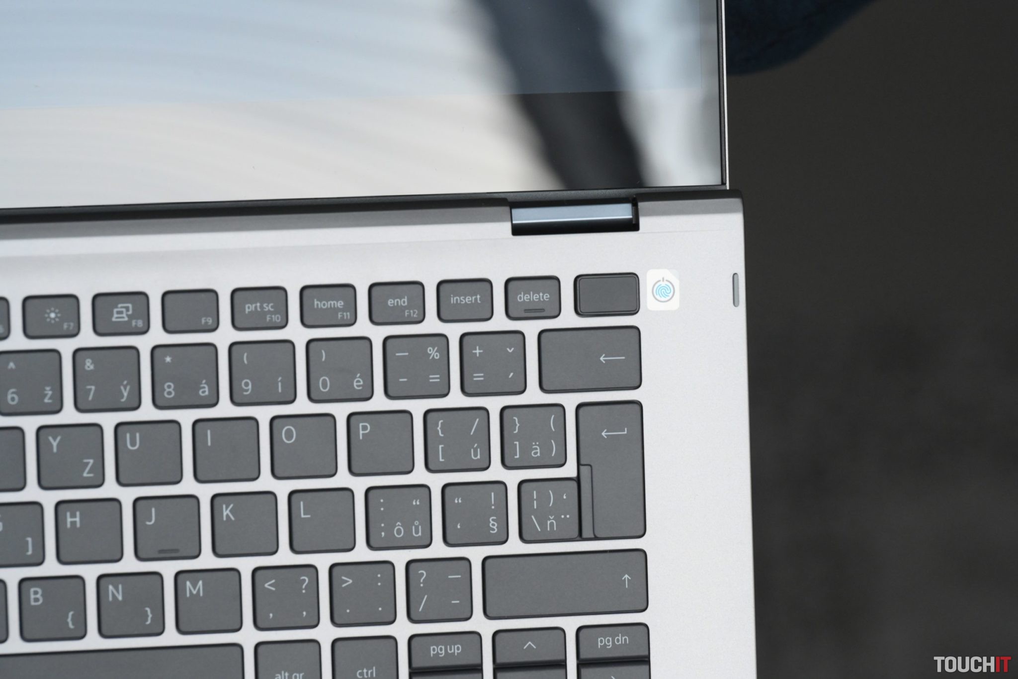 Ešte stále to nie je samozrejmosť a integrácia takéhoto prvku sa stále pohybuje vo vyššom segmente notebookov. Čítačka odtlačkov je súčasťou tlačidla na zapnutie notebooku. Je vpravo hore a tvorí jeden blok s klávesnicou. Tlačidlo je tuhšie a nestlačíte si ho omylom namiesto klávesu Delete.