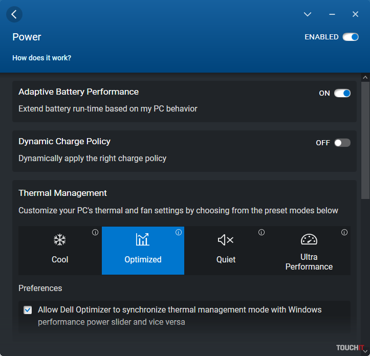Sú tu vlastné režimy výkonu, čo má dopad aj na ventilátor. Obdobu týchto nastavení majú aj iní výrobcovia. Dá sa nastaviť napríklad tichý chod, aby zbytočne nebežal ventilátor, ak to nechcete a notebook sa čím skôr prepol do menej výkonného režimu bez potreby chladenia vysokými otáčkami. Tiež si vyberáte, kedy chcete notebook nabíjať a kedy má bežať na batériu. Naopak, zvoliť sa dajú aj vysoké otáčky, ak chcete mať notebook chladný.