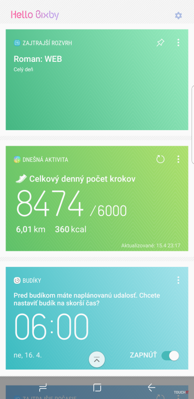 Bixby je niečo ako virtuálna asistentka v telefóne, pričom je to už druhý pokus Samsungu o niečo takéto. Samozrejme, na plné využitie treba najlepšie angličtinu. So slovenčinou sa zatiaľ v prípade Bixby nepočíta. Ale niečo z Bixby sa dá využiť a povieme si čo a ako. Ako sme spomínali, pre Bixby bolo pripravené aj samostatné hardvérové tlačidlo, to znamená, že s touto funkciou Samsung aj do budúcna naplno počíta. Po jej konfigurácii si môžete zvoliť, aké karty sa vám budú ponúkať ako prvé – napr. počet prejdených krokov, nastavený budík, kalendár a pod. Galaxy S8 sa pritom učí, čo je pre vás dôležité a v akej dobe. Podľa toho prispôsobuje karty. Napr. vám napovie komu obyčajne v aktuálnej dobe telefonujete a pripraví vám kartu na realizáciu hovoru. Celkom dosť toho o nás vie ten Samsung 🙂