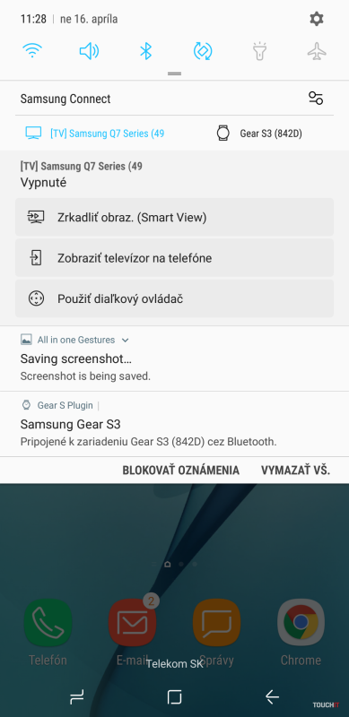 Toto je úplne nová aplikácia, ktorá v sebe spája kompatibilné Samsung zariadenia, ale aj ďalšie produkty. My sme si aplikáciu vyskúšali v spolupráci s novým televízorom QLED rady 7 a hodinkami Gear S3. Je veľmi dobré, že Samsung Connect vidíte hneď po potiahnutí palca smerom dole a hneď môžete tieto zariadenia ovládať. Napr. v prípade Gear S3 vidíte menu Hľadať moje hodinky Gear, Otvoriť aplikáciu Samsung Gear a Zrušiť párovanie. Pre Televízor máte ďalšie voľby: Zrkadliť obraz (Smart View), Zobraziť televízor na telefóne a Použiť diaľkový ovládač. Všetky užitočné voľby, ktoré spravíte veľmi rýchlo a ľahko, sa dajú takto ovládať. Galaxy S8 sa týmto stáva centrom ovládania vašej (Samsung) domácnosti, rovnako sa totiž dá ovládať klimatizácia, práčka alebo robotický vysávač.