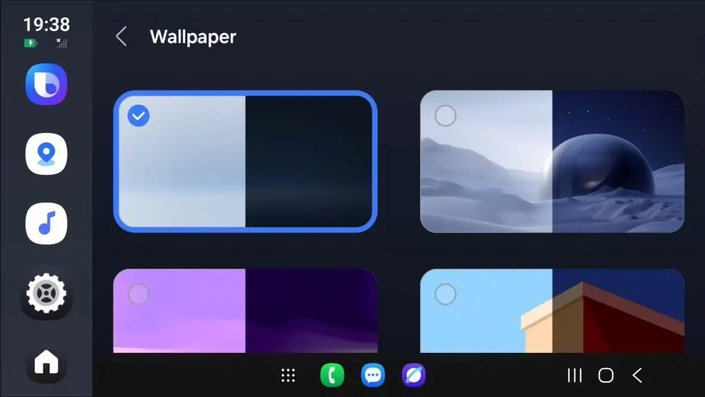 Nové screenshoty ukazujú aj druhý panel v spodnej časti obrazovky s klasickou trojtlačidlovou navigáciou Samsungu. Tento panel je možné skryť. Auto DeX ďalej ponúka svetlý a tmavý režim, možnosť meniť tapetu a widgety na hlavnej obrazovke. Farby aplikácií sa dokonca prispôsobujú tapete. K dispozícii sú widgety na počasie, kalendár, cestovné informácie, parkovanie, čerpacie stanice a ďalšie.