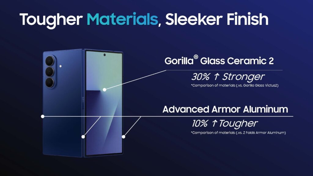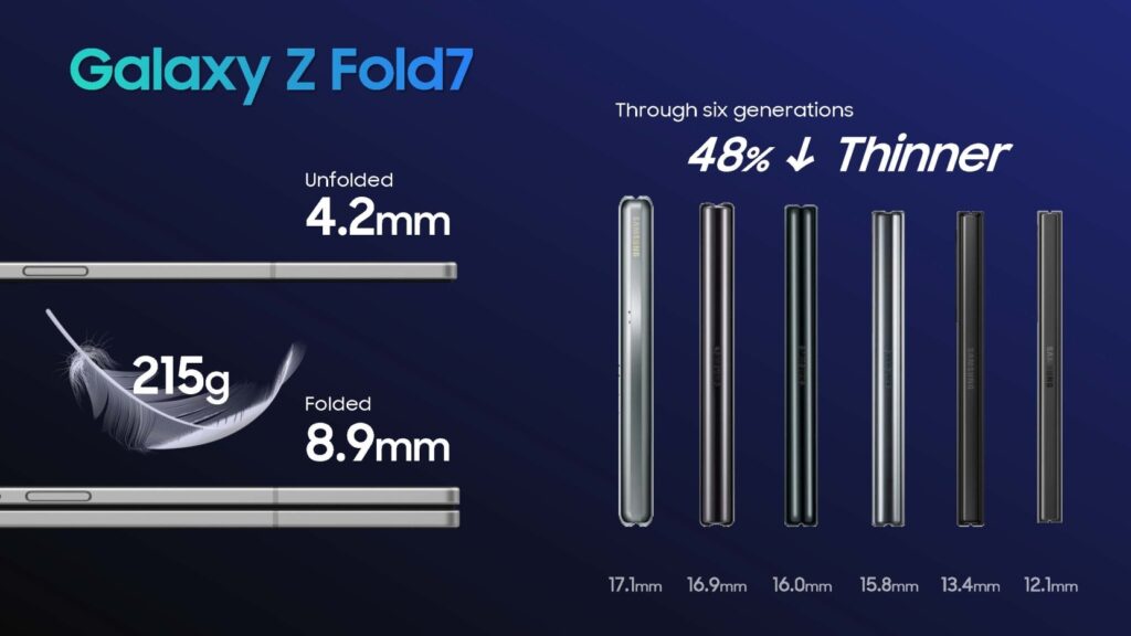 Hlavná pozornosť bola venovaná skladačke Galaxy Z Fold7. Tá má v rozloženom stave hrúbku len 4,2 mm, v najtenšej časti v zloženom stave je to 8,9 mm. Hmotnosť tohto skladacieho zariadenia je 215 g. Voči prvej skladačke od firmy Samsung, teda Galaxy Z Fold2 je to výrazné zníženie hrúbky celého zariadenia.